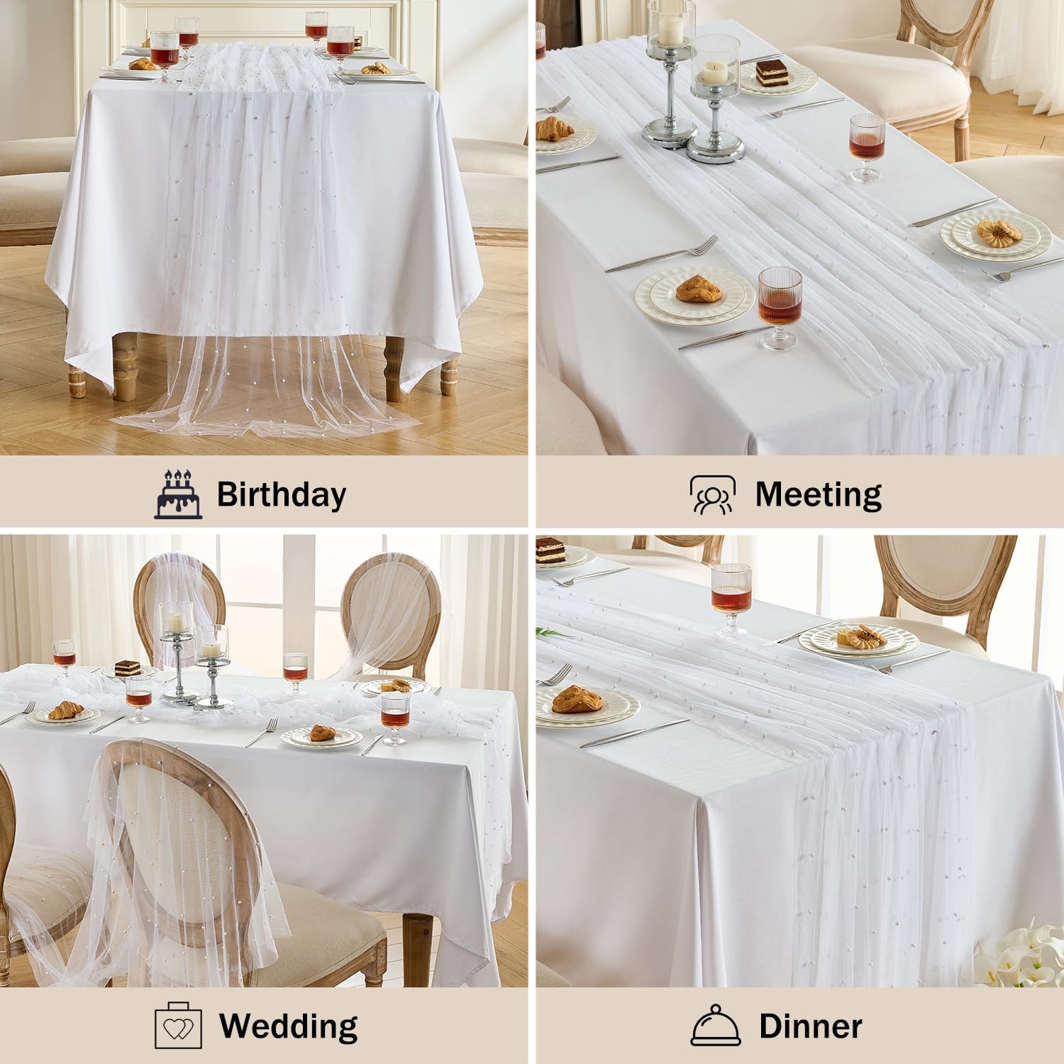 - Premium Material: Ivory white table runners made of excellent quality tulle fabric and smooth pearls, feel lightweight, touch softly, persistent and durable. Shiny pearls design, make sheer table runner more graceful than other Ivory white table runner