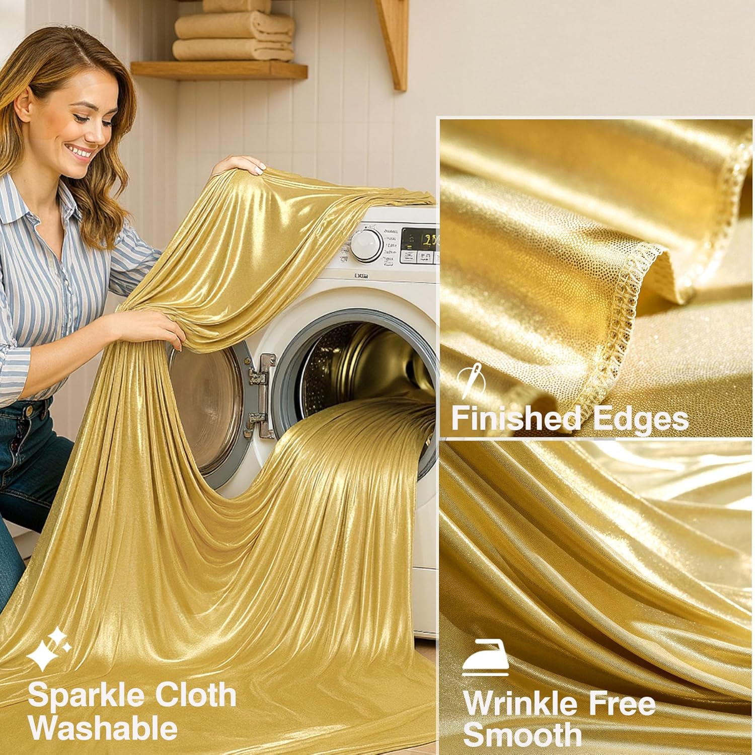 - Wrinkle Free Fabric: Silky Touch Feeling; Drape Nicely; Washable; Ironable; Reusable. You can keep this shiny backdrop drapes for future events. The soft fabric backdrops are perfect to create beautiful folds or leave it flowing loose onto the floor.