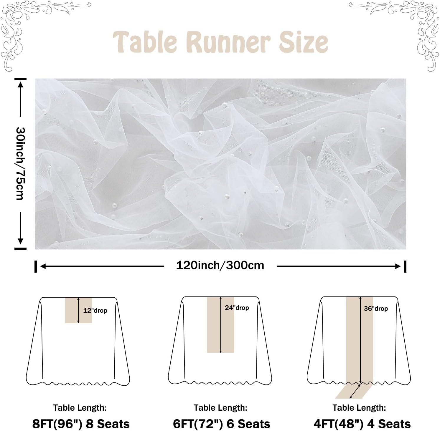 - Package Include: You will get 1 piece 10ft ivory white pearl table runner. Each pearl tulle table runner measures about 30 x 120 inches, which is an ideal size to dress up most rectangle and round tables, can also be joined together for long table decor