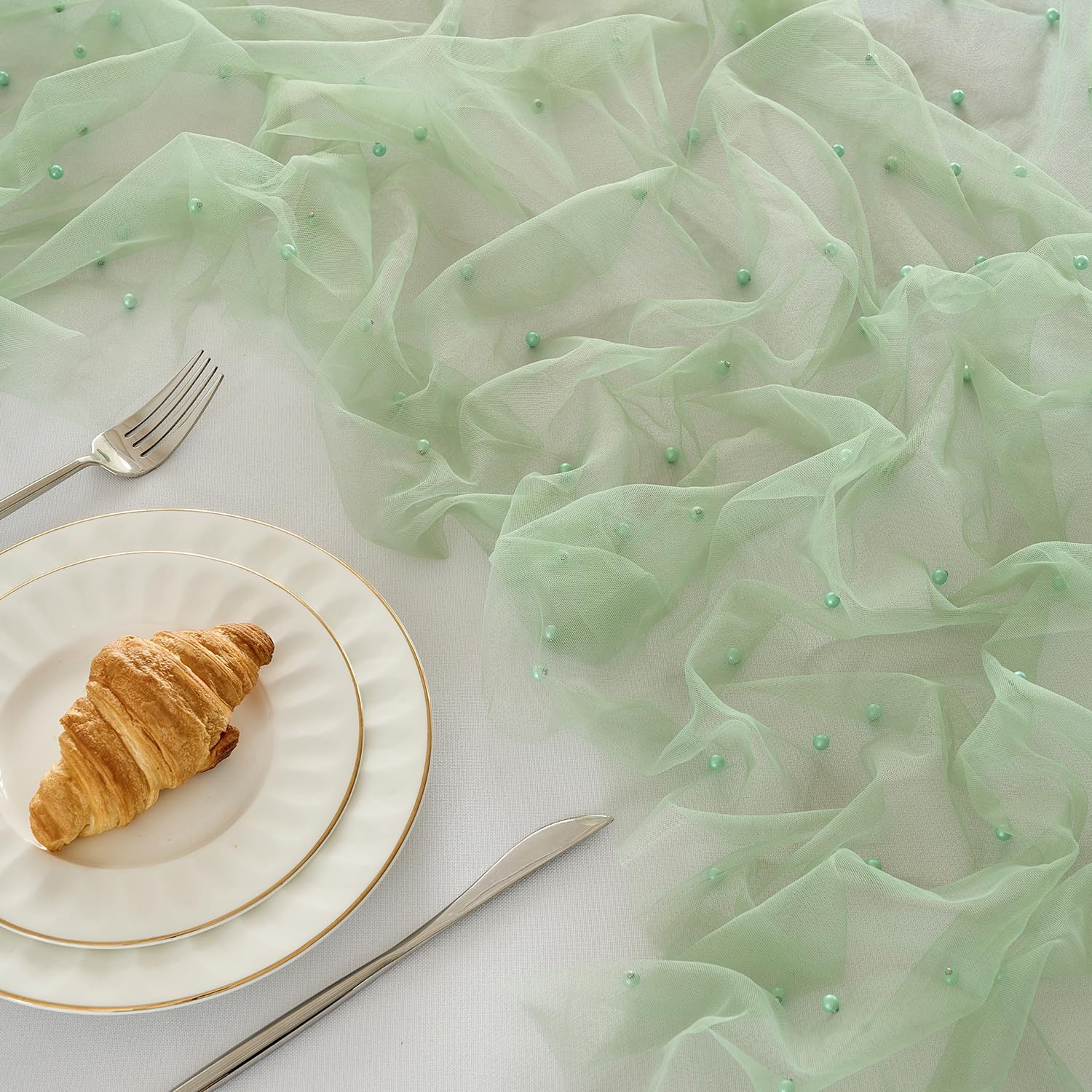 - Premium Material: Sage green table runners made of excellent quality tulle fabric and smooth pearls, feel lightweight, touch softly, persistent and durable. Shiny pearls design, make sheer table runner more graceful than other sage green table runner