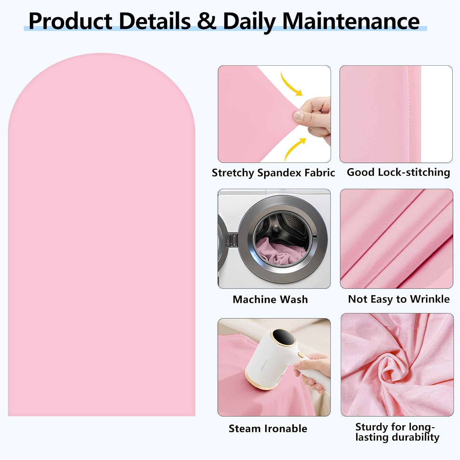 - Dimensions: 2 pieces different size of arch backdrop stand cover, providing an ideal background for photo opportunities and event decorations. Material: Premium and thick spandex and polyester fabric. Size: 7.2 ft(H)x4 ft(W), 6 ft(H)x2.6 ft(W). Color: Pink