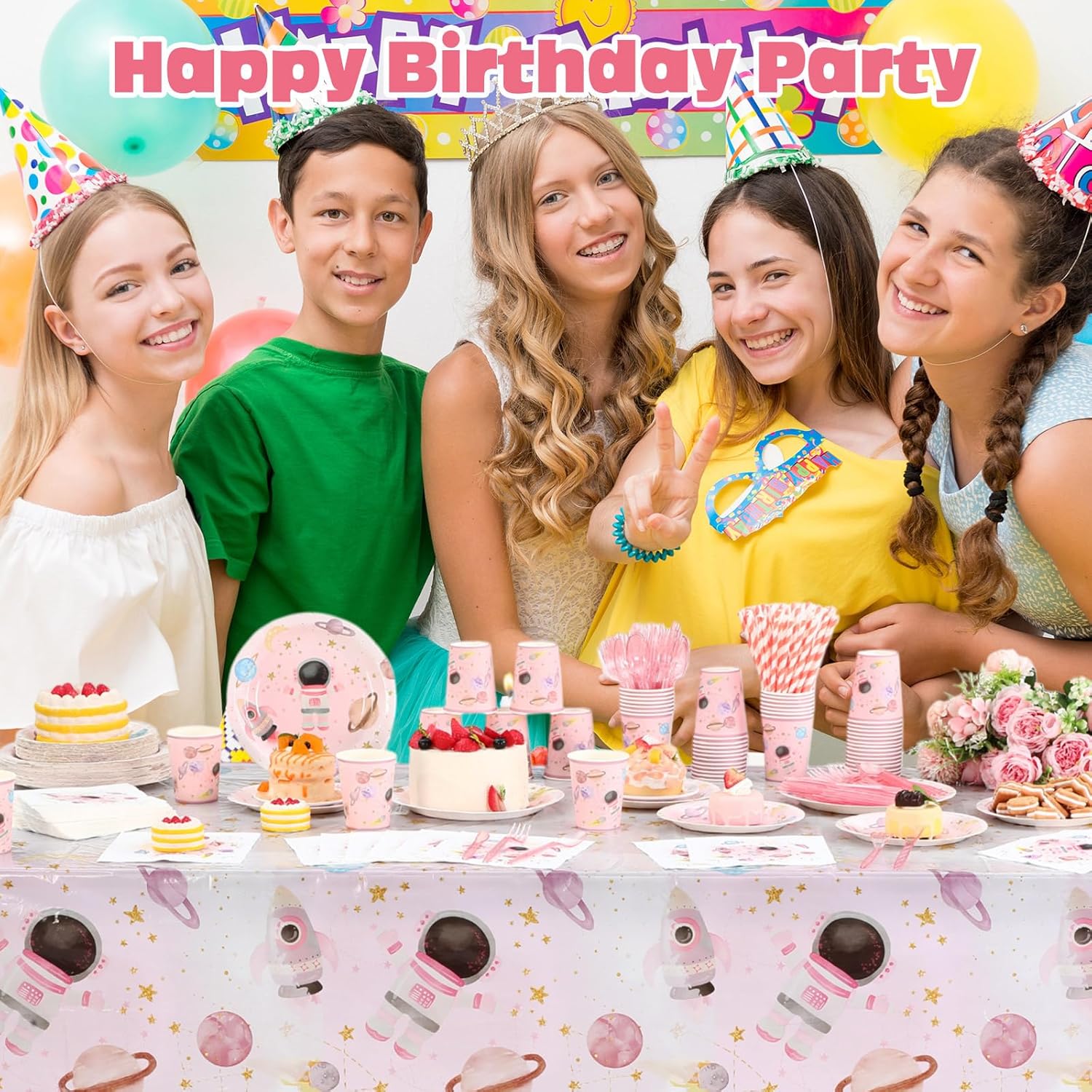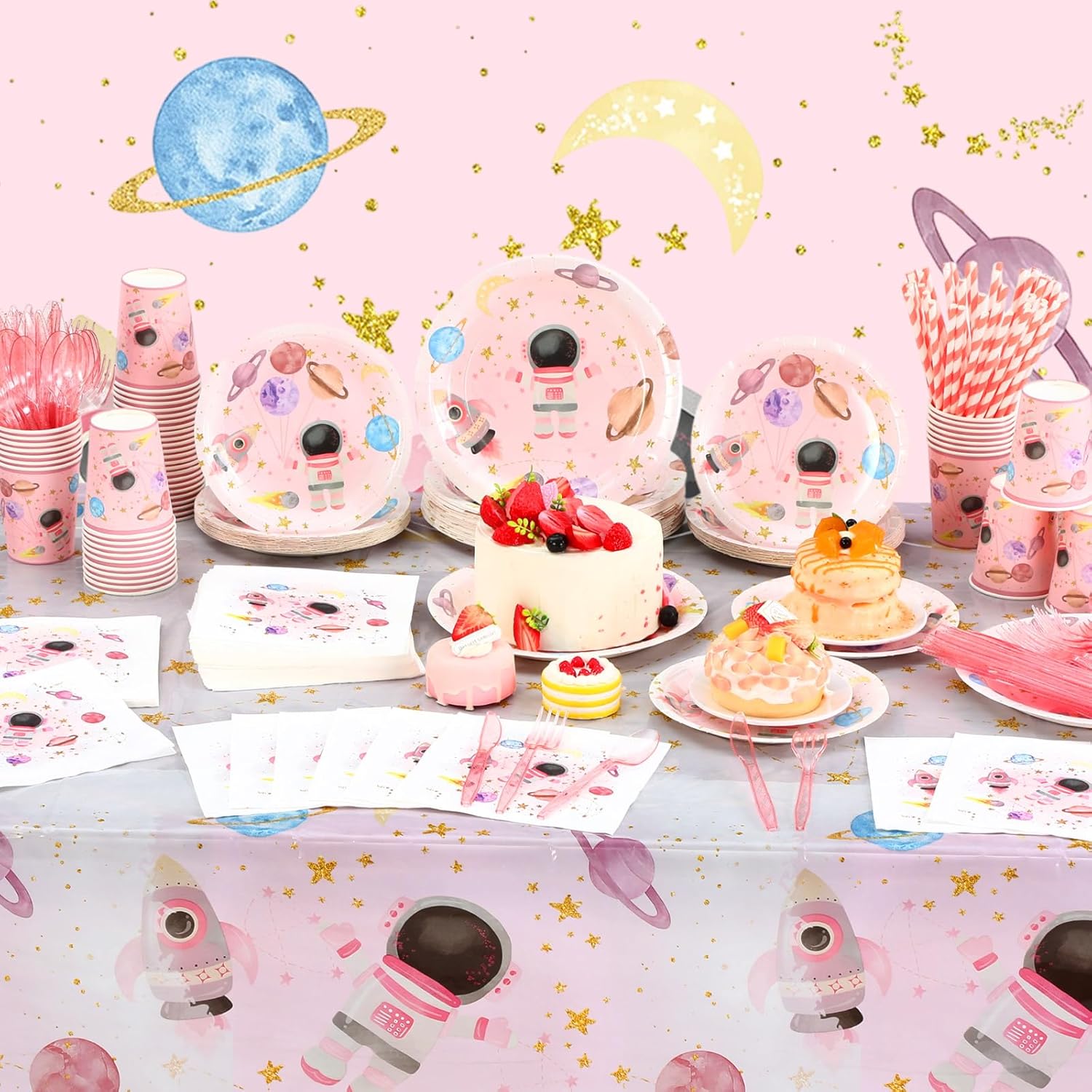 452 Pcs Pink Space Birthday Decorations for 50, Star Astronaut Paper Plates Napkins Cups Moon Tablecloth Cutlery Straws for Solar System Planets Baby Shower Party Supplies Decorations