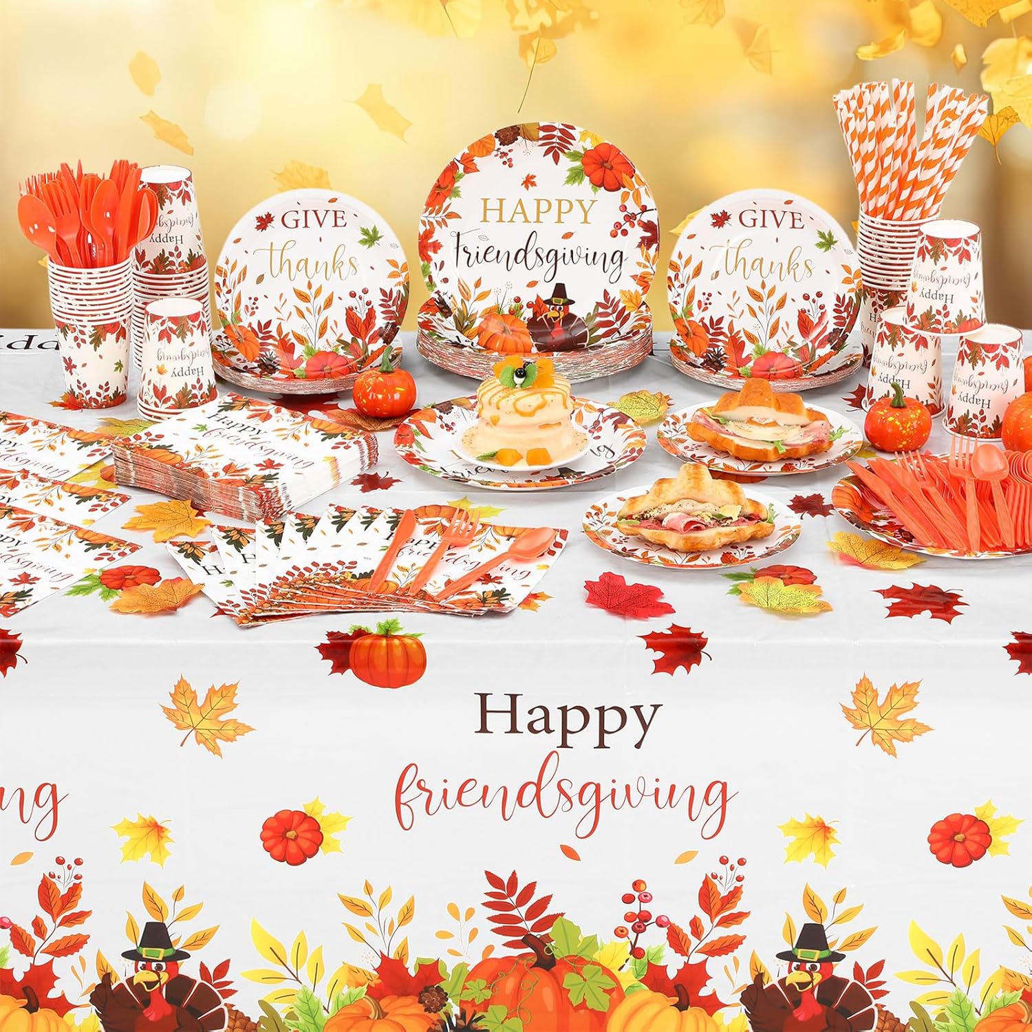 - Generous Package: our friendsgiving party decorations contain 100 each of paper plates (2 sizes) and napkins, 50 coffee cups, 50 sets of knives, forks, and spoons each, and 50 straws, it's an ideal solution for Thanksgiving Day table decoration needs, and we also include 2 large sized happy friendsgiving tablecloths