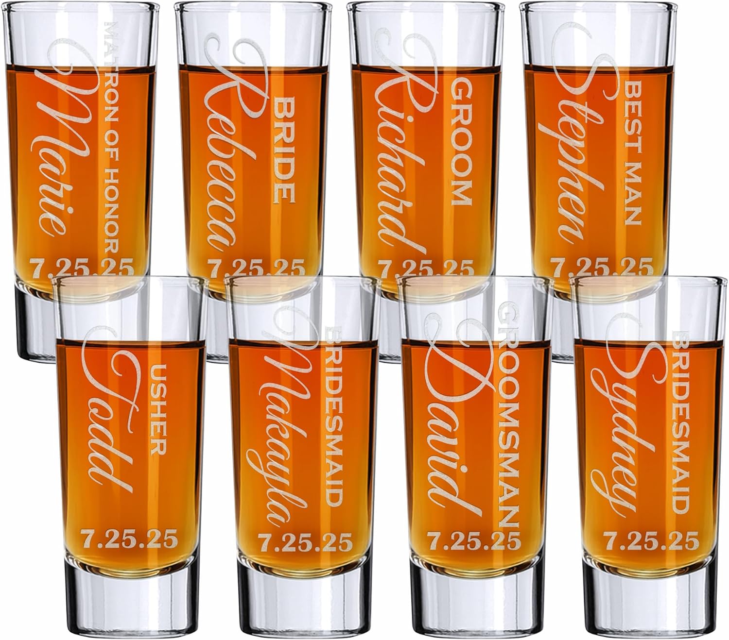 Custom Engraved 2 oz Shot Glass – Personalized Etching – Groomsman & Bridesmaid Gift – Wedding Favor Set of 8
