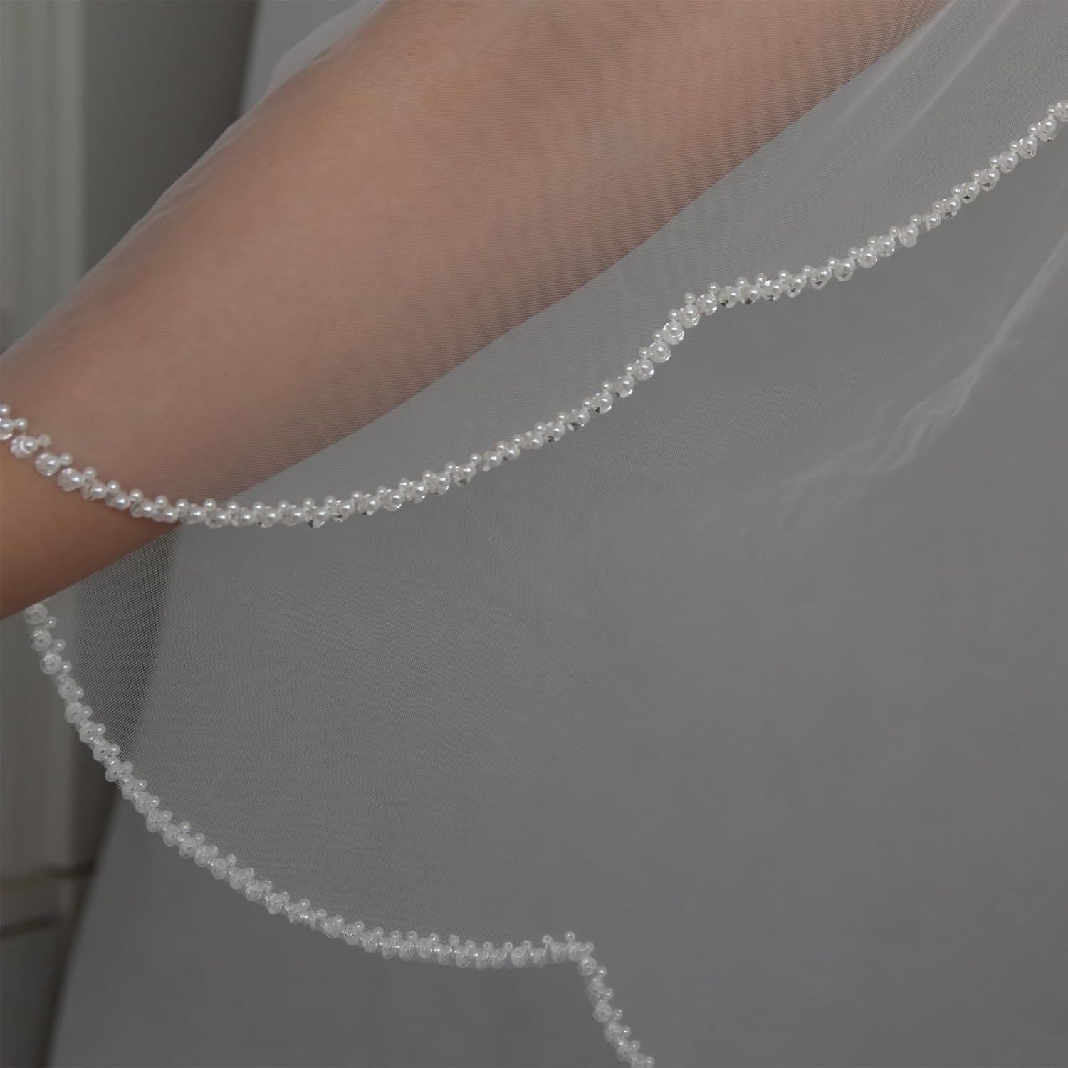 Bridal Veils Pearls and Crystals Beaded Edge Fingertip Length Wedding Veil for Women