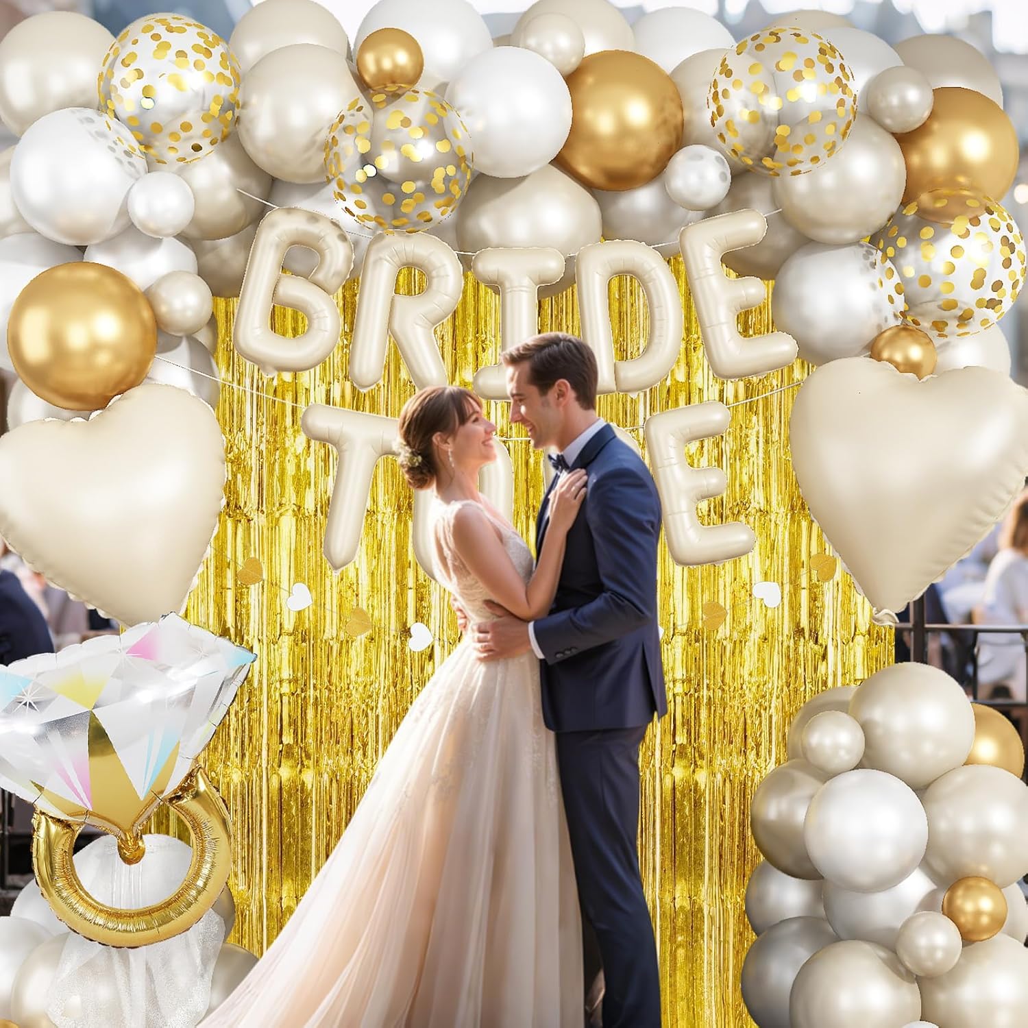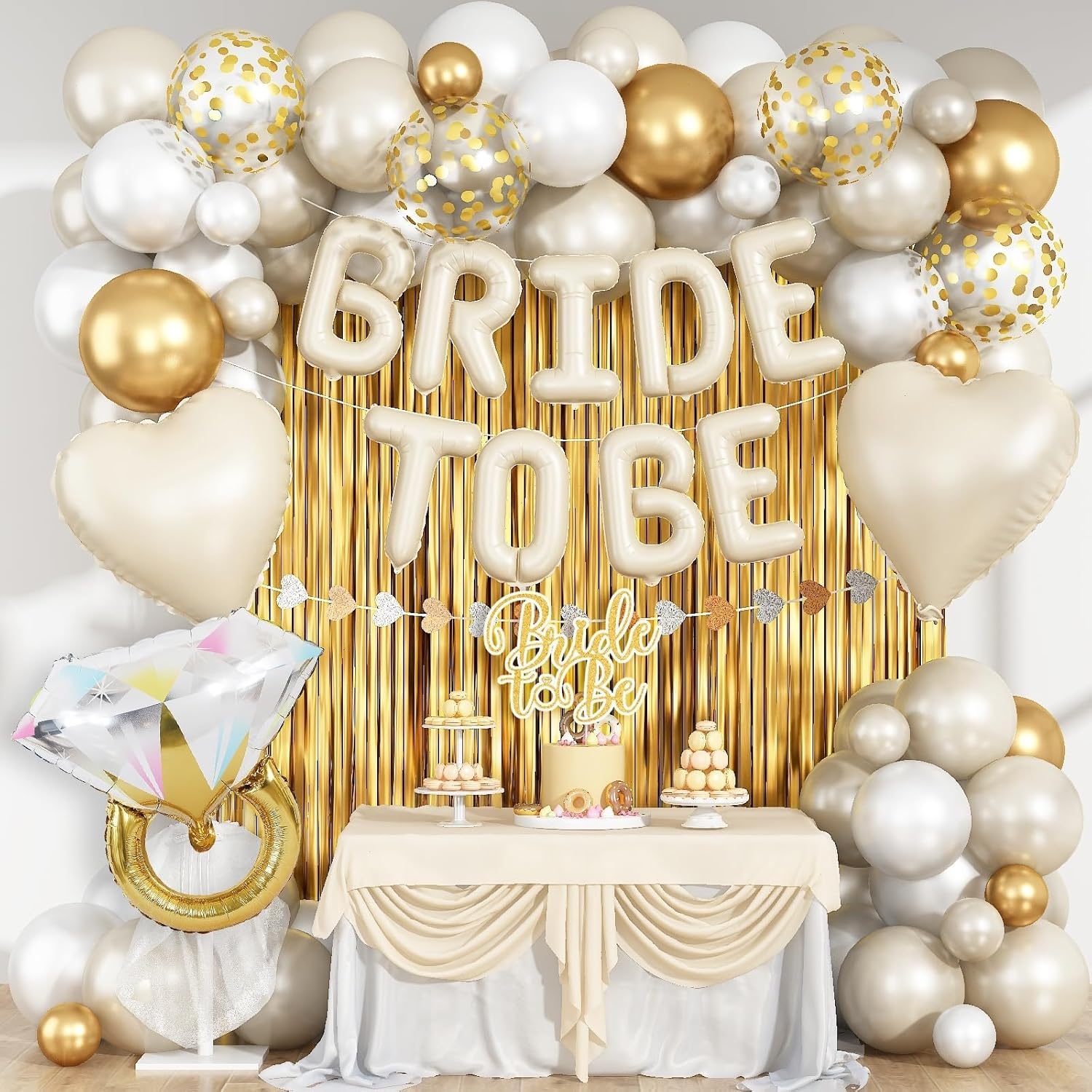 - Included Components : Bride To Be Mylar Foil Letter Balloons, White Gold Balloons Diamond Ring and Cream Heart Balloon, Gold Fringe Curtains (2pcs), Color Hearts Banner, Cake Topper, 12" Gold/Gold Confetti/Sand White/Pearl White Balloons (18pcs), 5" Gold/Sand White/Pearl White Balloons (9pcs), Balloon Tools (3pcs) Bride To Be Mylar Foil Letter Balloons, White Gold Balloons Diamond Ring and Cream Heart Balloon, Gold Fringe Curtains (2pcs), Color Hearts Banner… See more