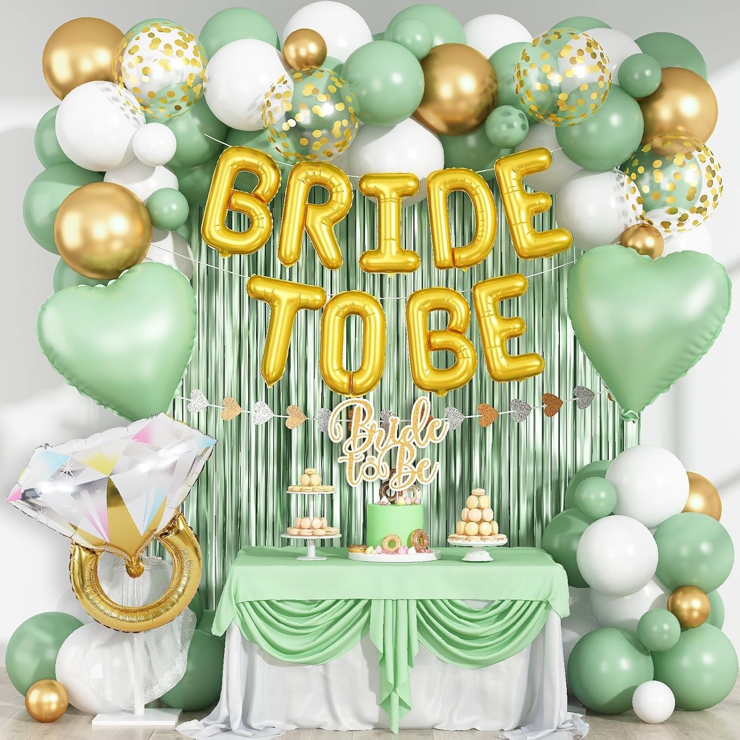 - Sage Green Bachelorette Party Decorations: These bachelorette accessories for bride include 1pc 16" gold BRIDE TO BE foil balloon, 2pcs sage green fringe curtains, 2pcs 18" heart balloons, 1pc cake topper, 1pc color hearts banner, 12" sage green/gold/white/gold confetti balloons(18pcs), 5" sage green/gold/white white balloons(9pcs) and 3pcs balloon tools—perfect for bridal celebration setups.