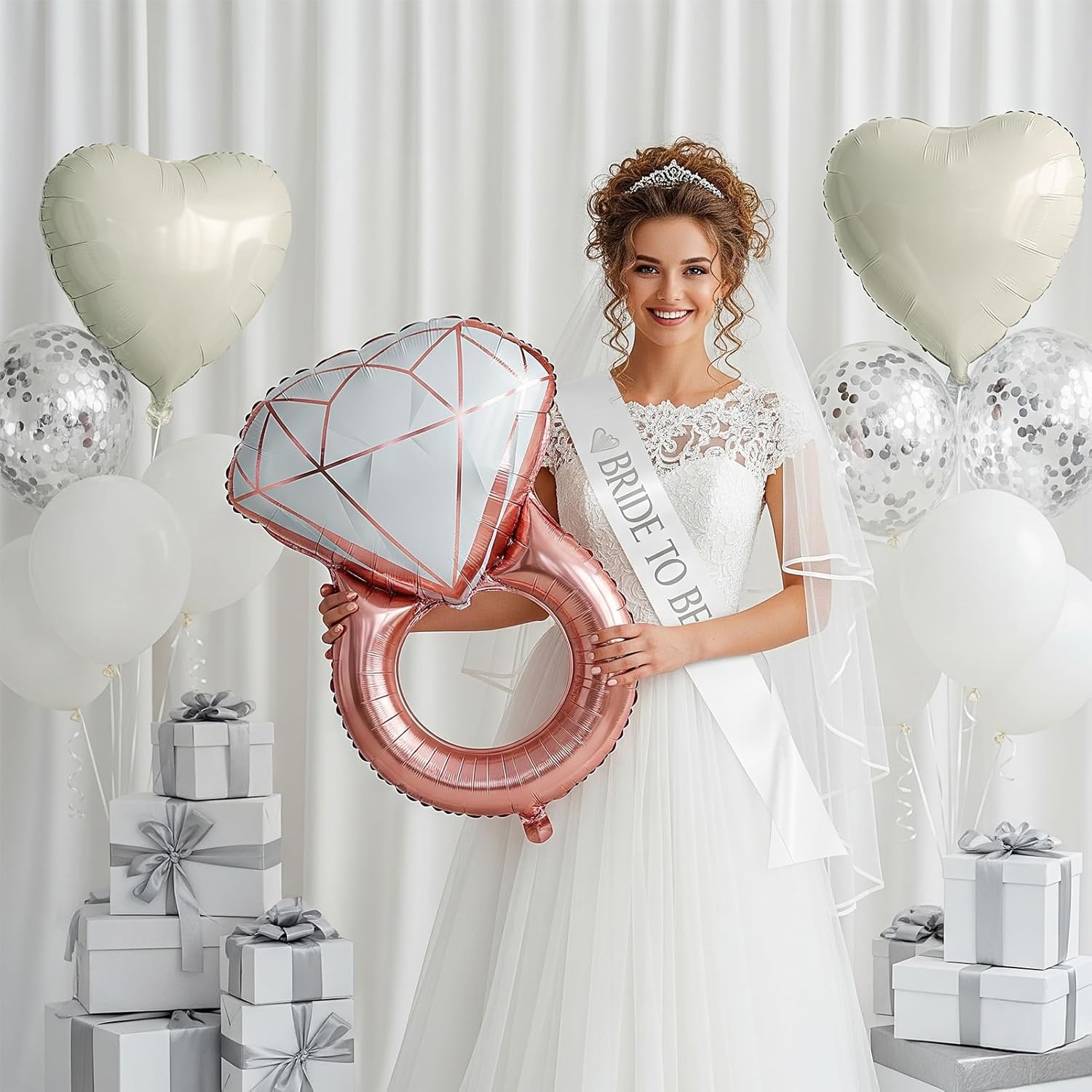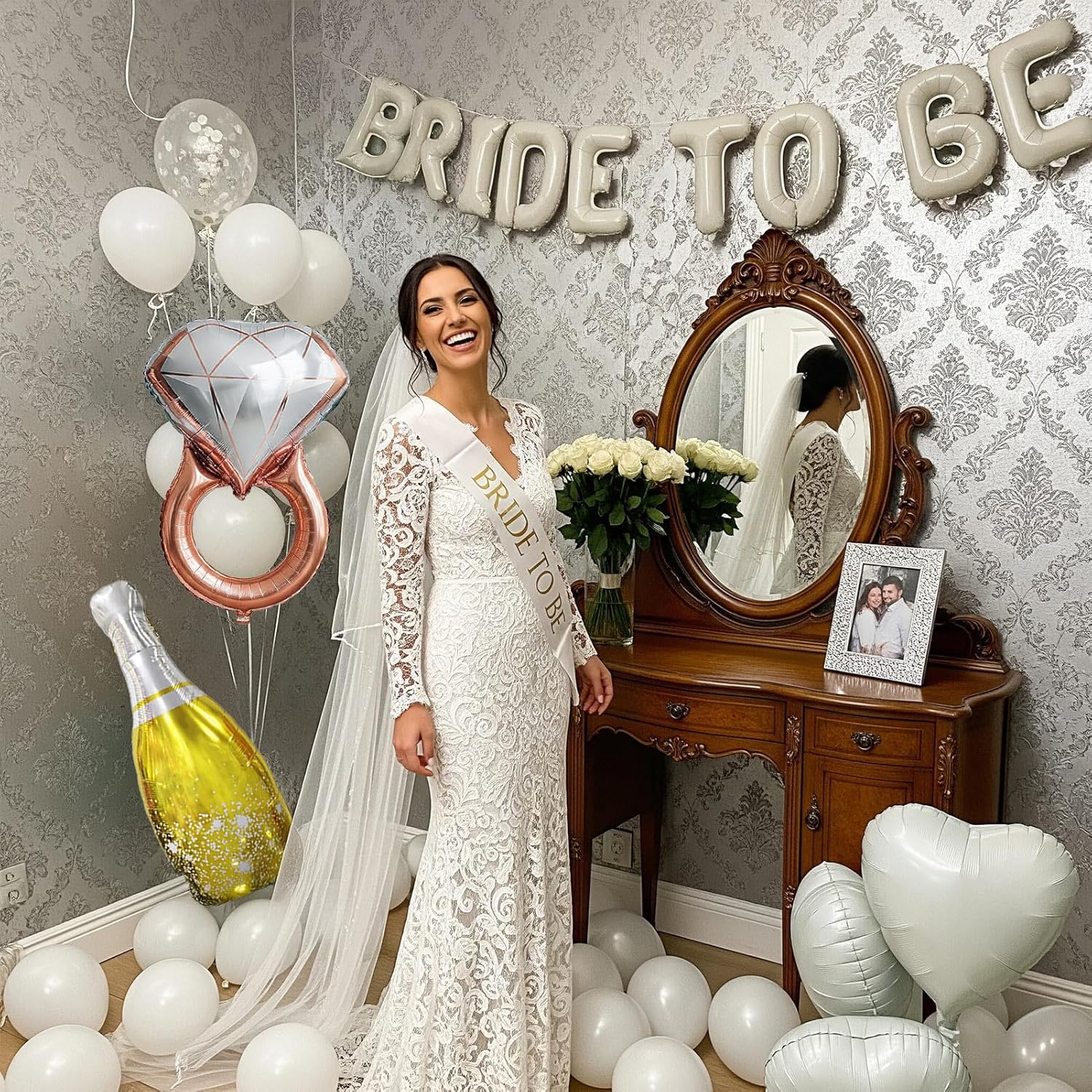 - Complete Bridal Glamour: All-in-One Celebration! This kit provides everything to create a fully coordinated and glamorous bridal theme. Beyond the elegant balloons, you get prominent sand white "BRIDE TO BE" foil letters, romantic sand white heart-shaped foil balloons, celebratory champagne bottle foil balloons, an impressive diamond ring foil balloon, a beautiful veil, and a chic sash. This ensures a cohesive and immersive setting for capturing those precious pre-wedding memories.