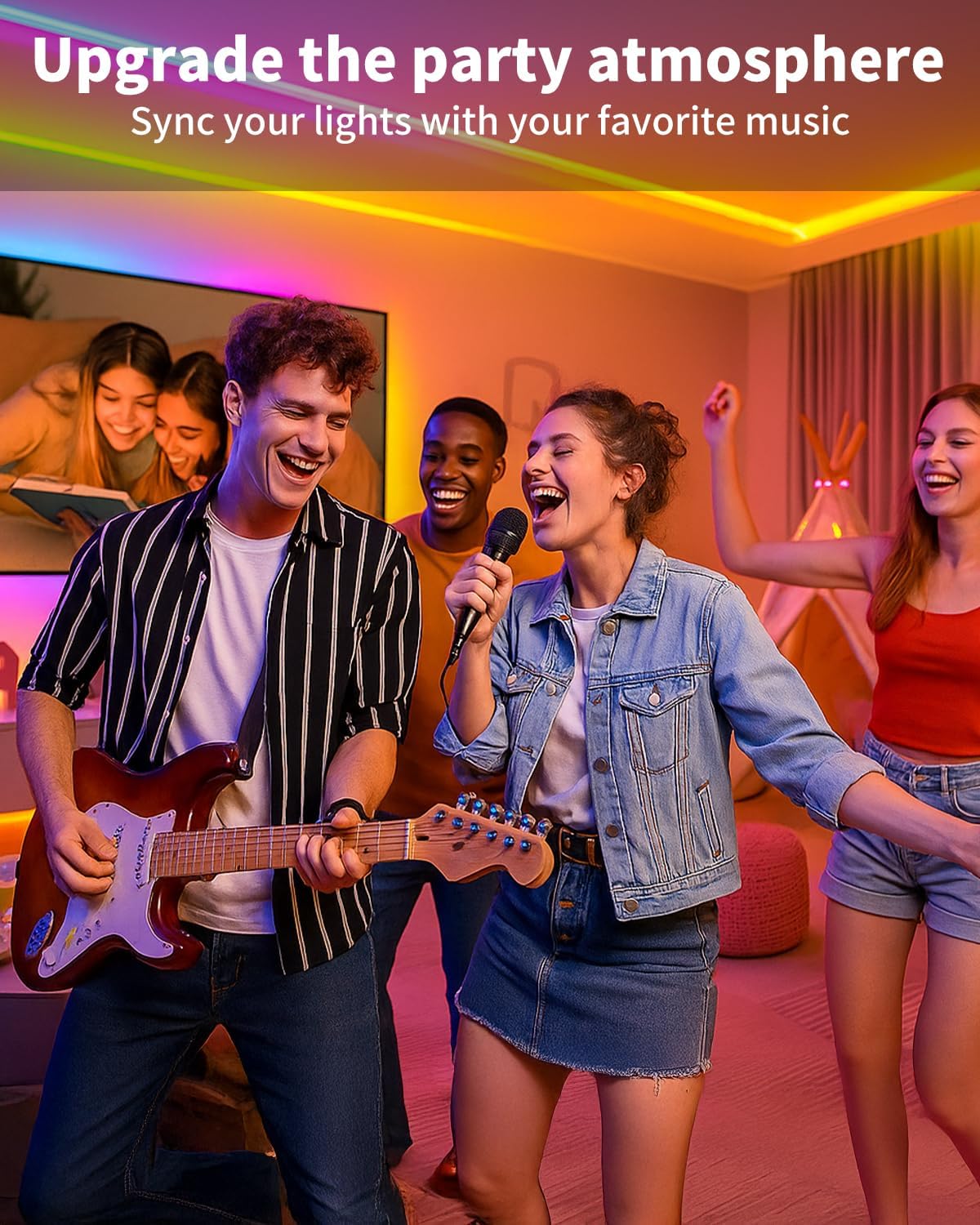 - MUSIC SYNC MODE: The strip light has a smart Music Mode , allowing led lights to change colors in sync with the music. You can also choose 22 unique patterns. Each mode can be applied to different scenes, and everything is under control!