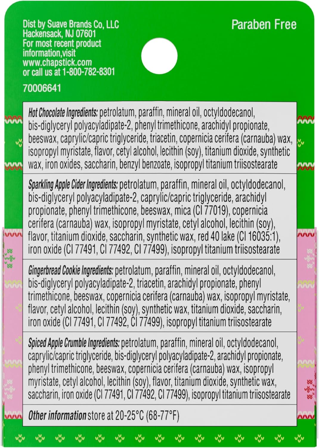 - LIMITED-EDITION HOLIDAY FLAVORS: Classic ChapStick hydration meets festive flair with limited-edition flavors like Hot Chocolate, Sparkling Apple Cider, Candy Cane, Gingerbread Cookie, Spiced Apple Crumble, and Holiday Nog, perfect for gift-giving or a little seasonal self-care