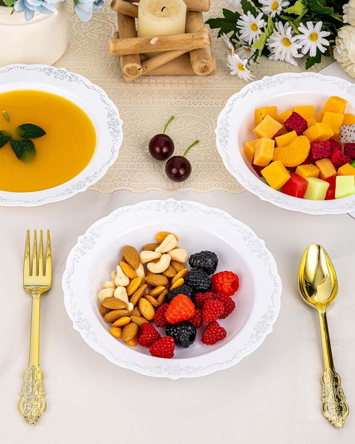 - Elegant Design: BESTLUCK disposable bowls feature vintage silver pattern engravings on the rim, complementing various colored dinnerware. They add an elegant touch to any occasion, from casual gatherings to formal wedding banquets. Each plastic bowl is designed with a wide rim for comfortable handling and effective spill prevention