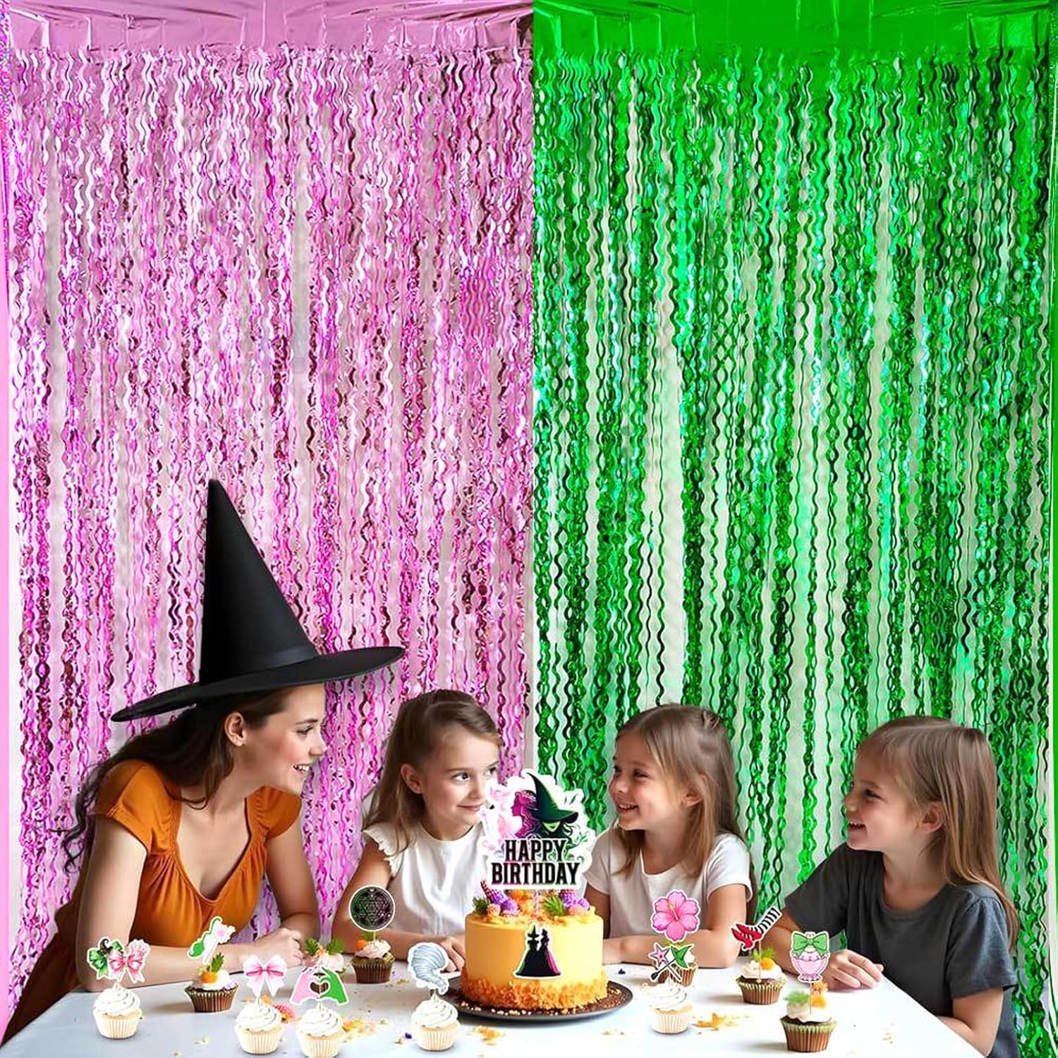 CANREVEL 2 Pack 3.3x6.6 Feet Pink and Green Wavy Foil Fringe Backdrop Curtains, Tinsel Streamers for Wicked Witch Merch Decor Birthday Party, Graduation, Halloween Party Decorations
