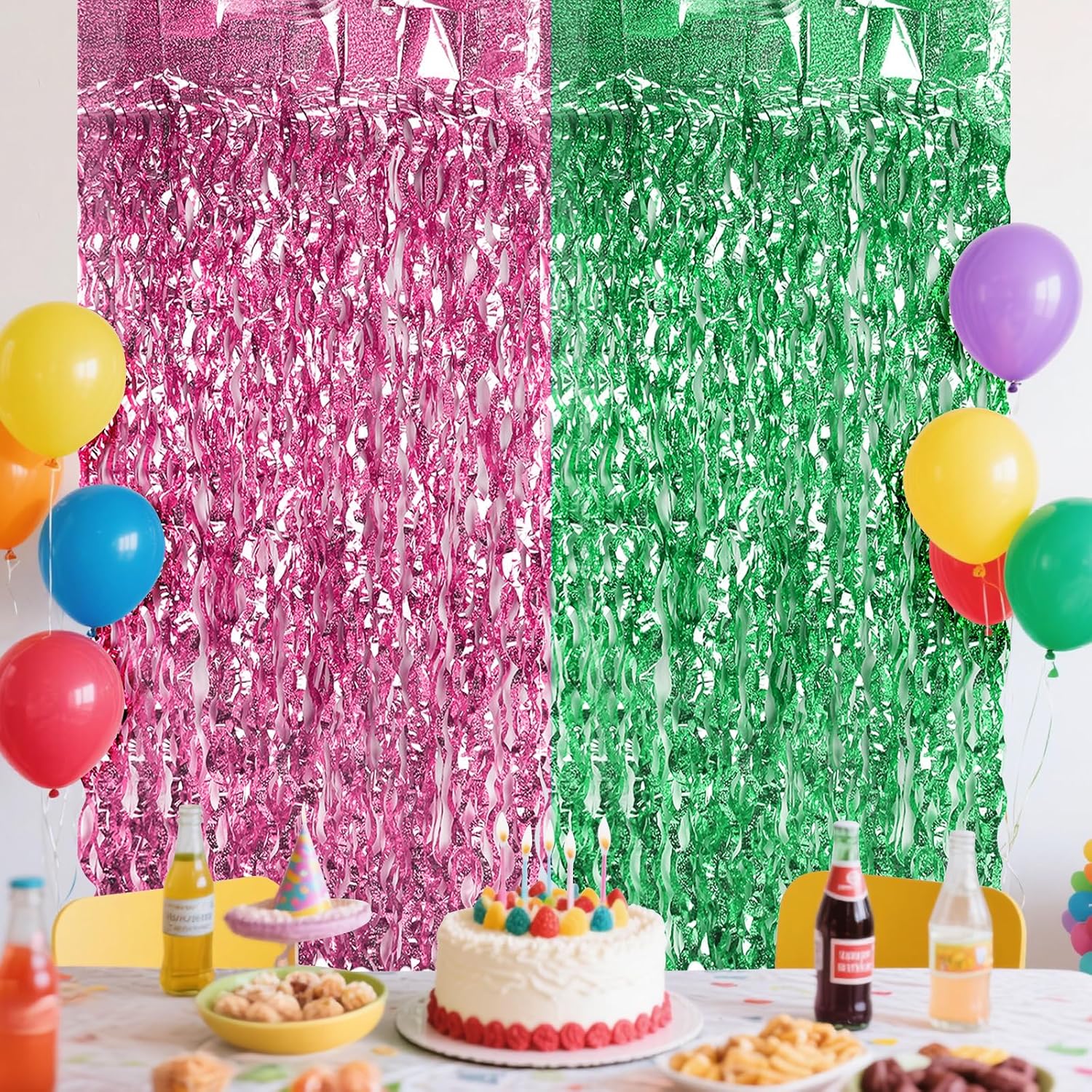 - 🎉PACKAGE INCLUDED : 2 pack of Pink and Green Wavy foil fringe curtains, the size of each tinsel curtain is 3.3 ft x 8.2 ft, enough length for hanging on a door or covering a wall fully, suitable for any parties.