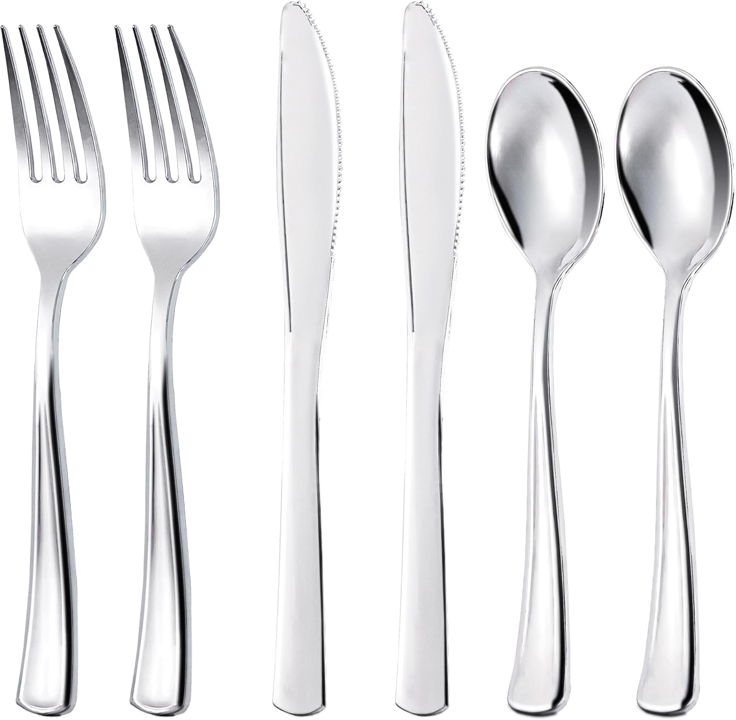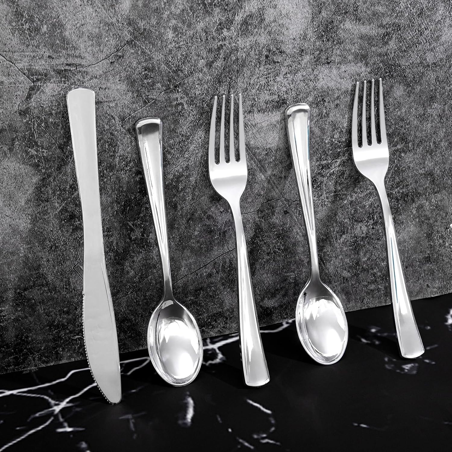 - Complete 300-Piece Set for 100 Guests: Each silver disposable cutlery pack includes 100 silver plastic forks, 100 spoons, and 100 knives β perfect for large events. No last-minute shortages or mismatched utensils!