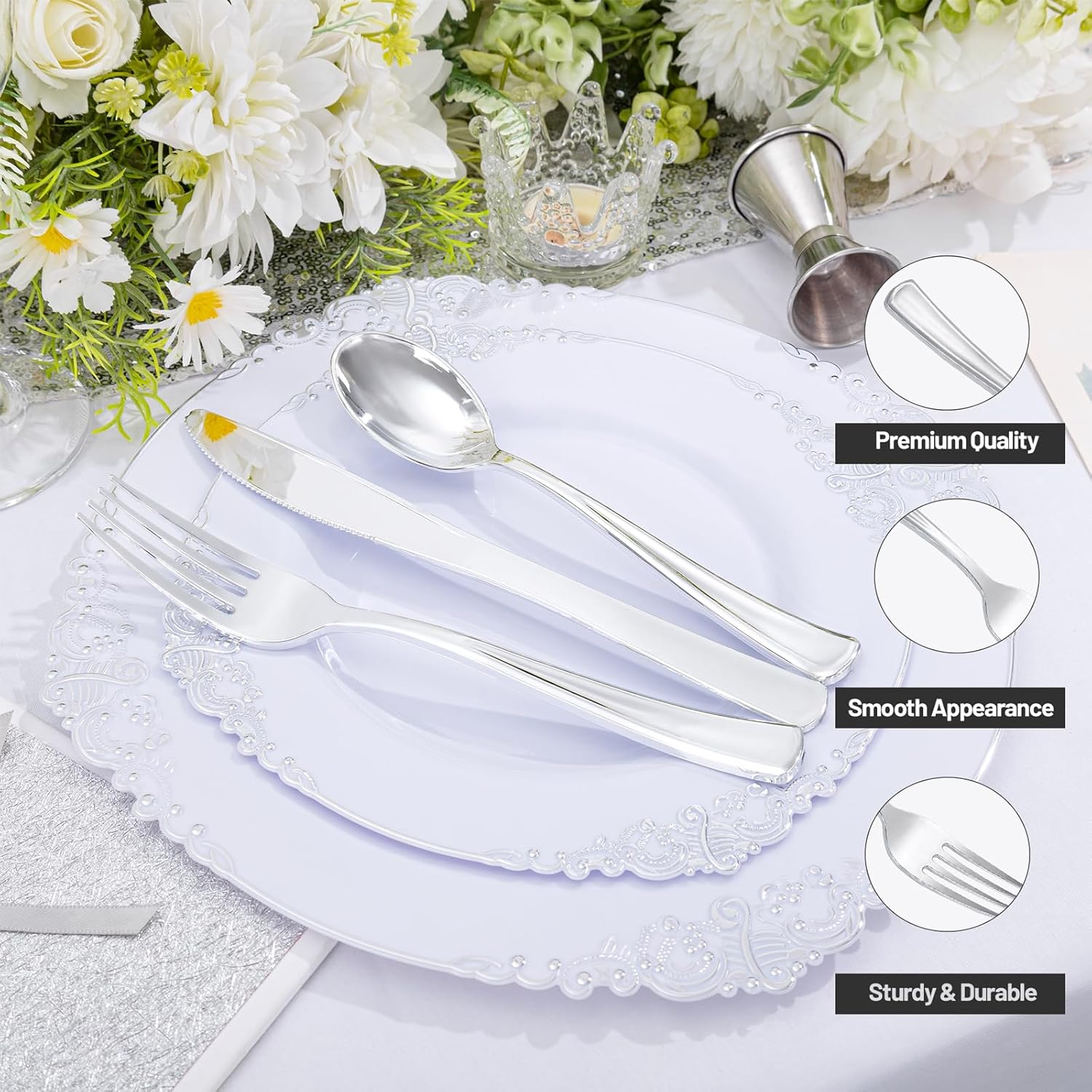 - Luxury & Elegant for Every Occasion: Elevate your table settings with our fancy silver silverware set, designed to mimic high-end metal cutlery. The shimmering silver finish adds a touch of retro sophistication to weddings, galas, or holiday gatherings.
