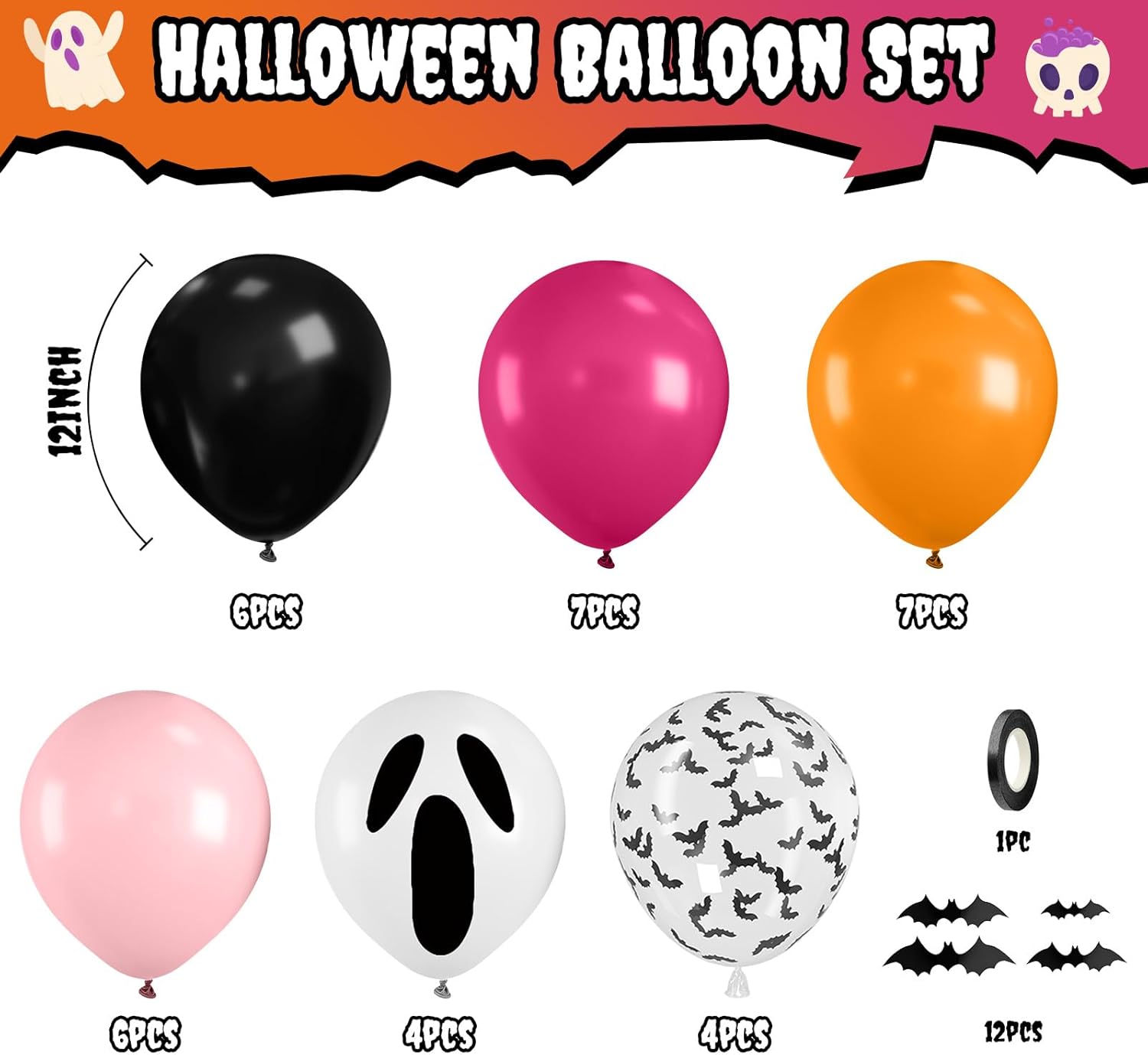 - 35 Pcs Halloween Balloon Set: Bring spooky fun to your Halloween celebration with this vibrant Halloween balloons set, including 7* hot pink balloons, 7* orange balloons, 6* pastel pink balloons, 6* black balloons, 4* bat-print balloons, 4* ghost-print balloons, 1*10m ribbon, and 1 set of 3D Halloween bats stickers. These Halloween balloons create a fun, spooky backdrop for parties, trick-or-treating, and photos.