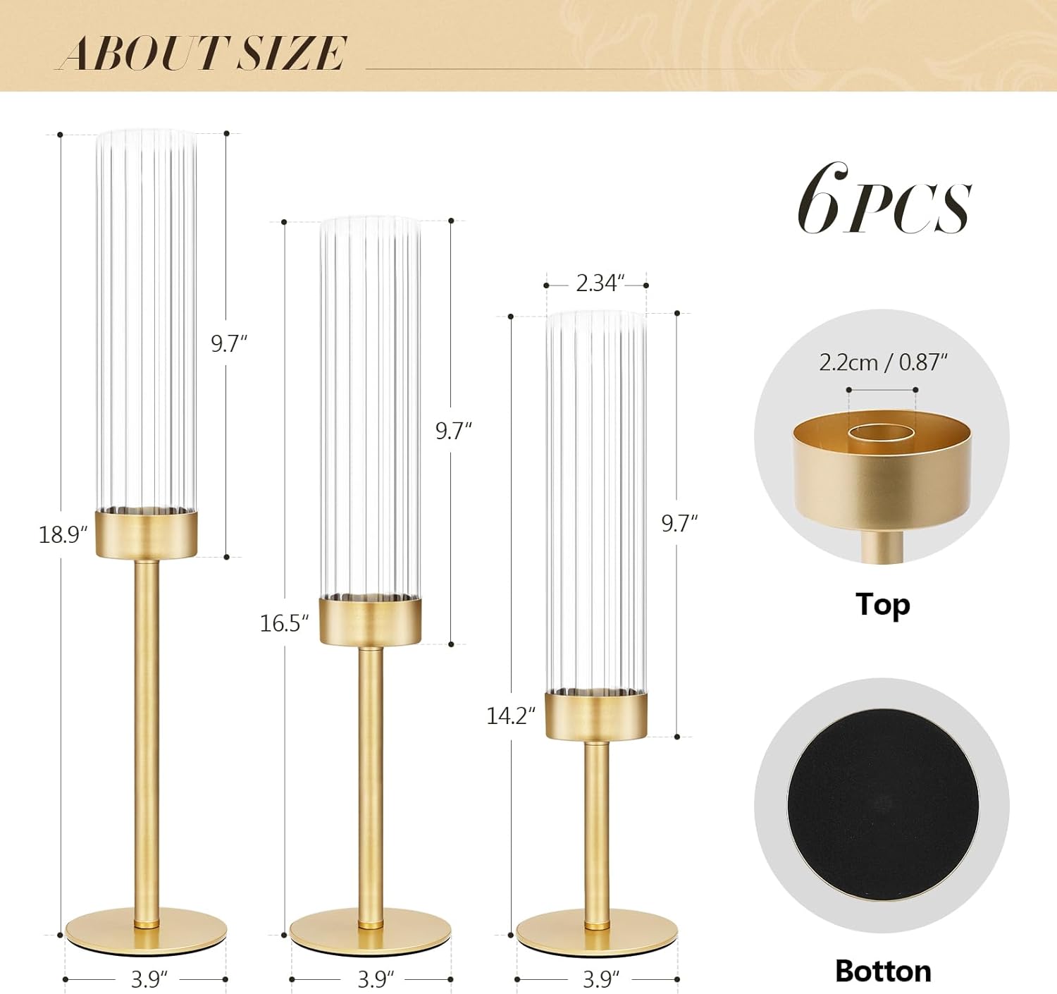 Glass Hurricane Candlestick Holders Gold, KSWING Set of 6 Taper Candle Holders Brass Tall Clear Candle Stand Holders, Perfect for Table Centerpiece Party Wedding Christmas Home Decor