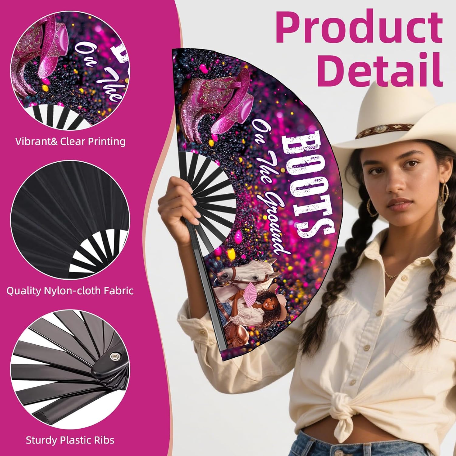 - 【Unique Boots on The Ground Hand Fan】The Boots on The Ground hand fan features a charming cowboy boots theme, designed specifically for women. With its vibrant colors and intricate details, this hand fan not only provides a refreshing breeze but also adds a touch of Western flair to any outfit.
