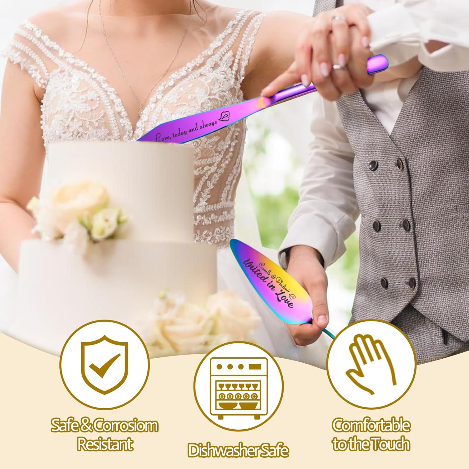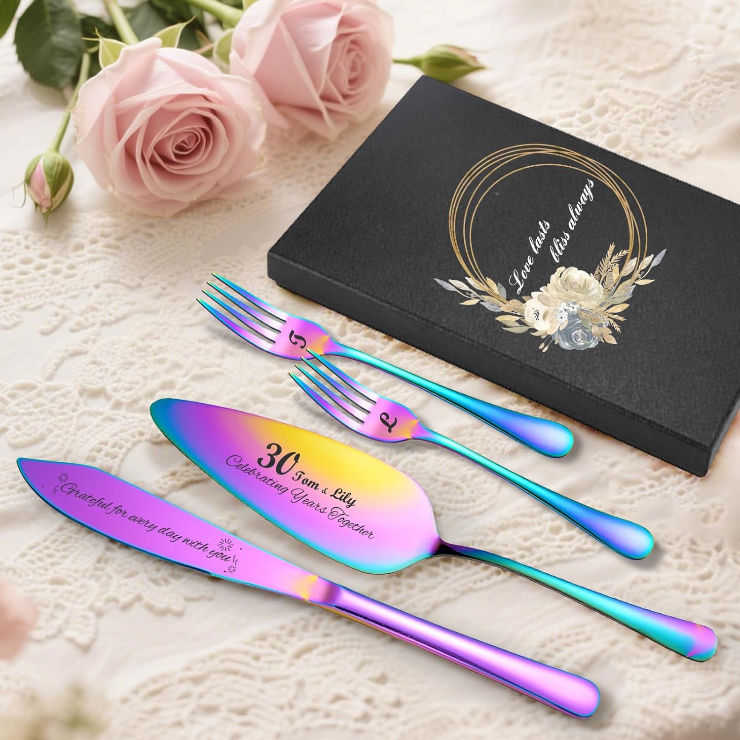 Personalized 4 Piece Wedding Cake Cutting Set, Custom Names Cake Knife and Server set with Forks, Anniversary Birthday Bridal Wedding Registry Gifts (Multi-color)