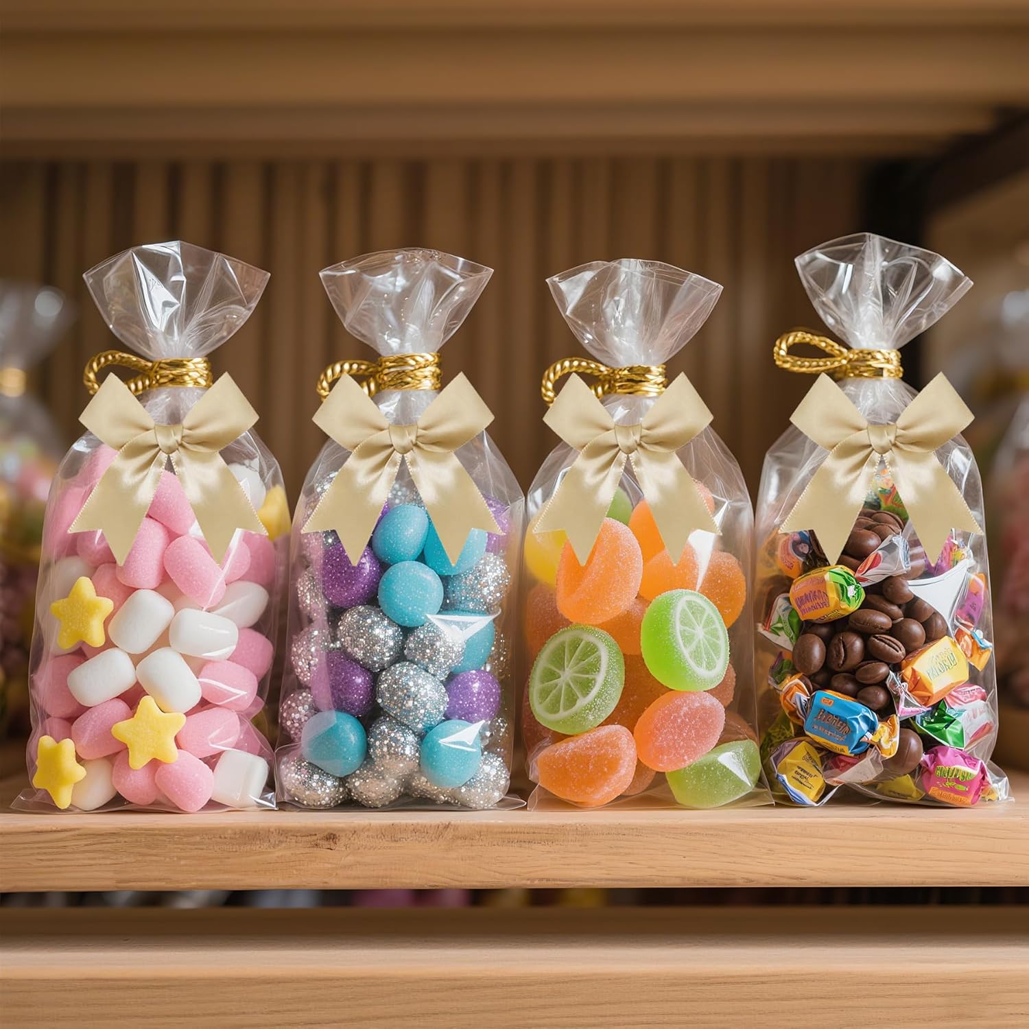 50 PCS Twist Tie Bows Satin Ribbon Bows 3.3 Inch Gift Wrap Bows Craft Bows for Gift Wrapping, Party Decorations Gifts Bag DIY Treat Bags Wedding Decor Baby Shower Christmas (Golden)