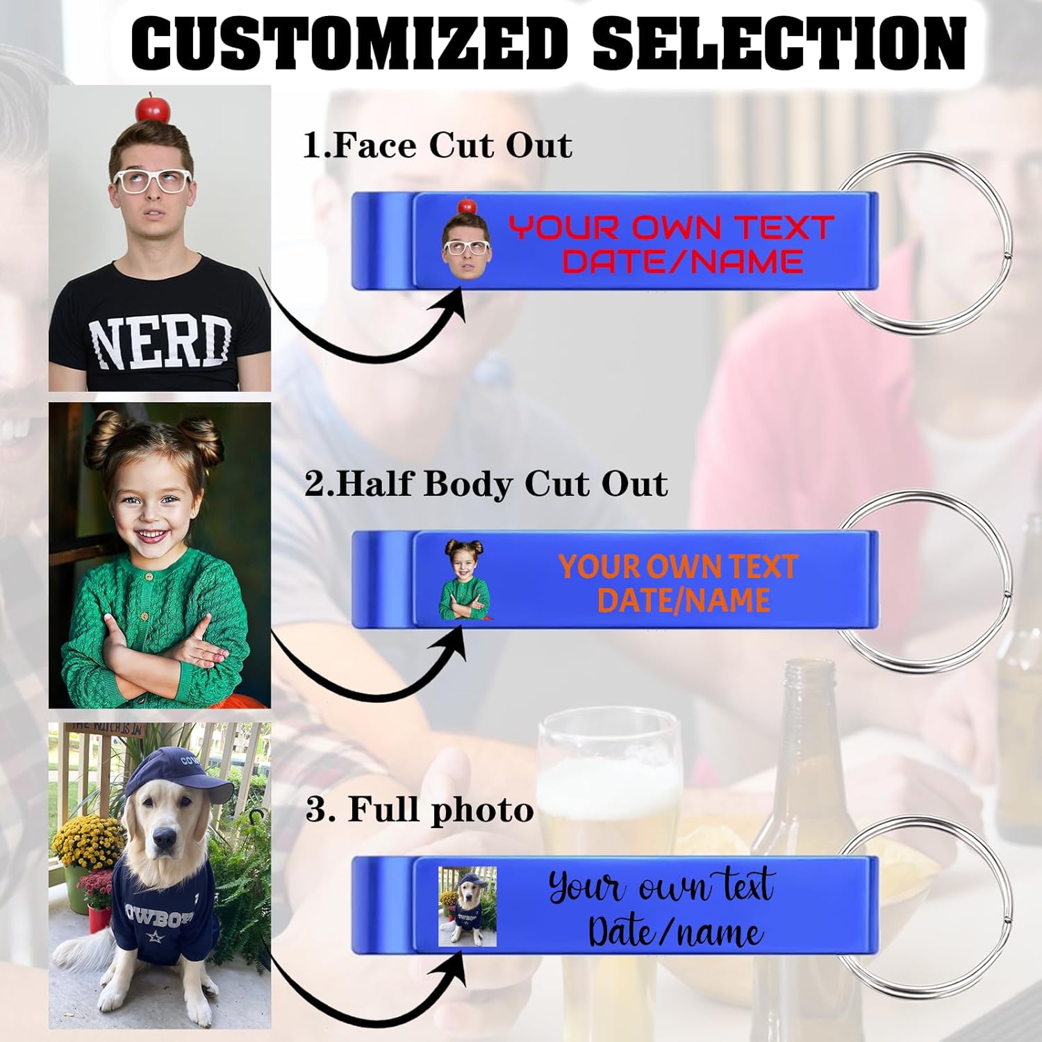 - Three-in-One Functionality: Keychain, Bottle Opener, and Unique Business Card. Our versatile personalized bottle opener keychain combines a stylish key carrier, a handy bottle opener, and a memorable promotional tool all in one. Always within reach, this design ensures your message resonates