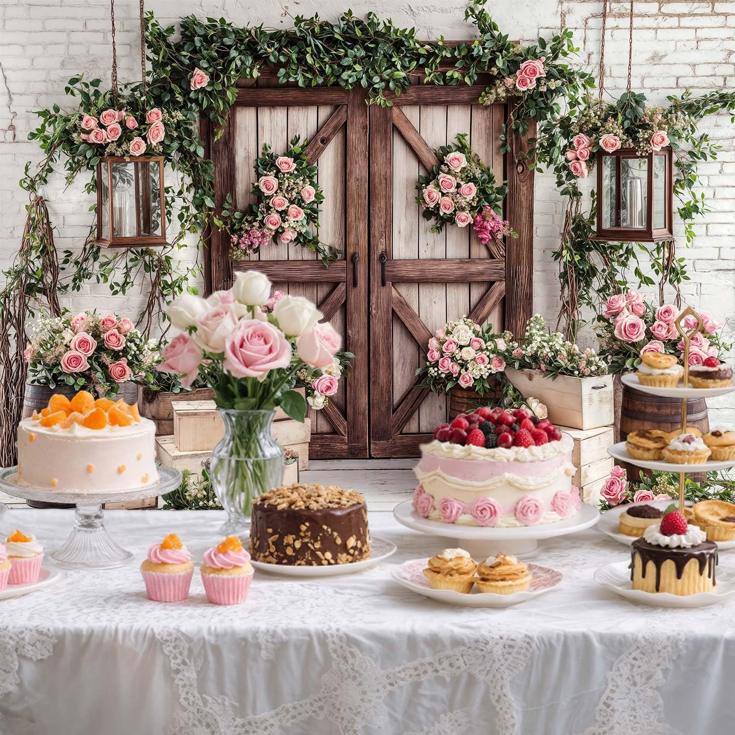 10x10ft Country Wedding Photography Backdrop Floral Rustic Roses Farmhouse Wooden Door Backdrop Pink Flower Birthday Baby Shower Wedding Bridal Party Banner Photo Booth Props Anniversary Background