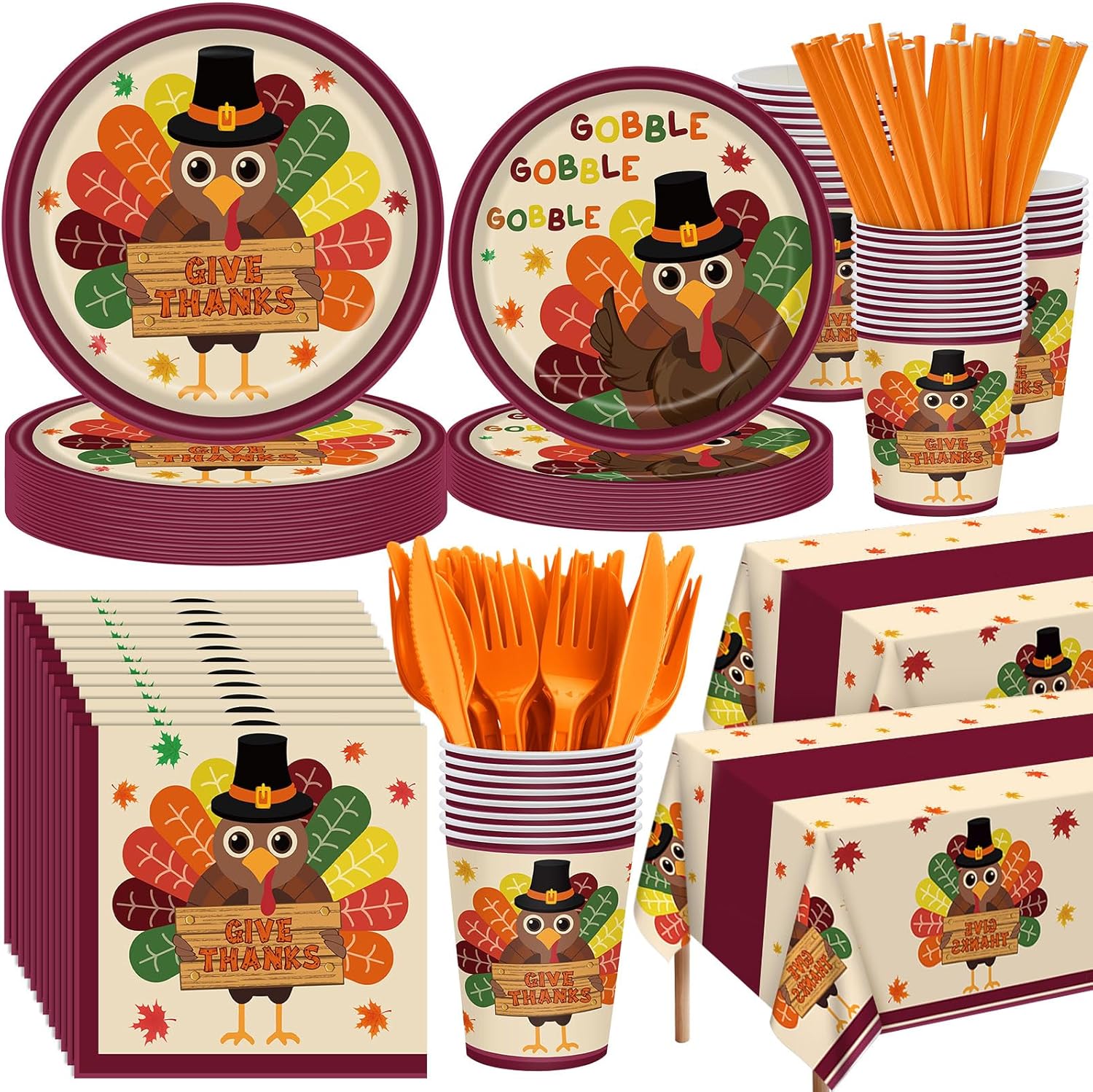 - Quality Material Adoption: crafted with durable materials, our turkey party supplies boast durability and reliability, each plate, cup, napkin, and straw is made of sturdy paper, ready for both hot and cold beverages, and meals, the knives, forks, and spoons are constructed from robust plastic, providing a strong cutlery solution for your food servings, and this tablecloth is a PE plastic offering ideal coverage and protection of your surfaces