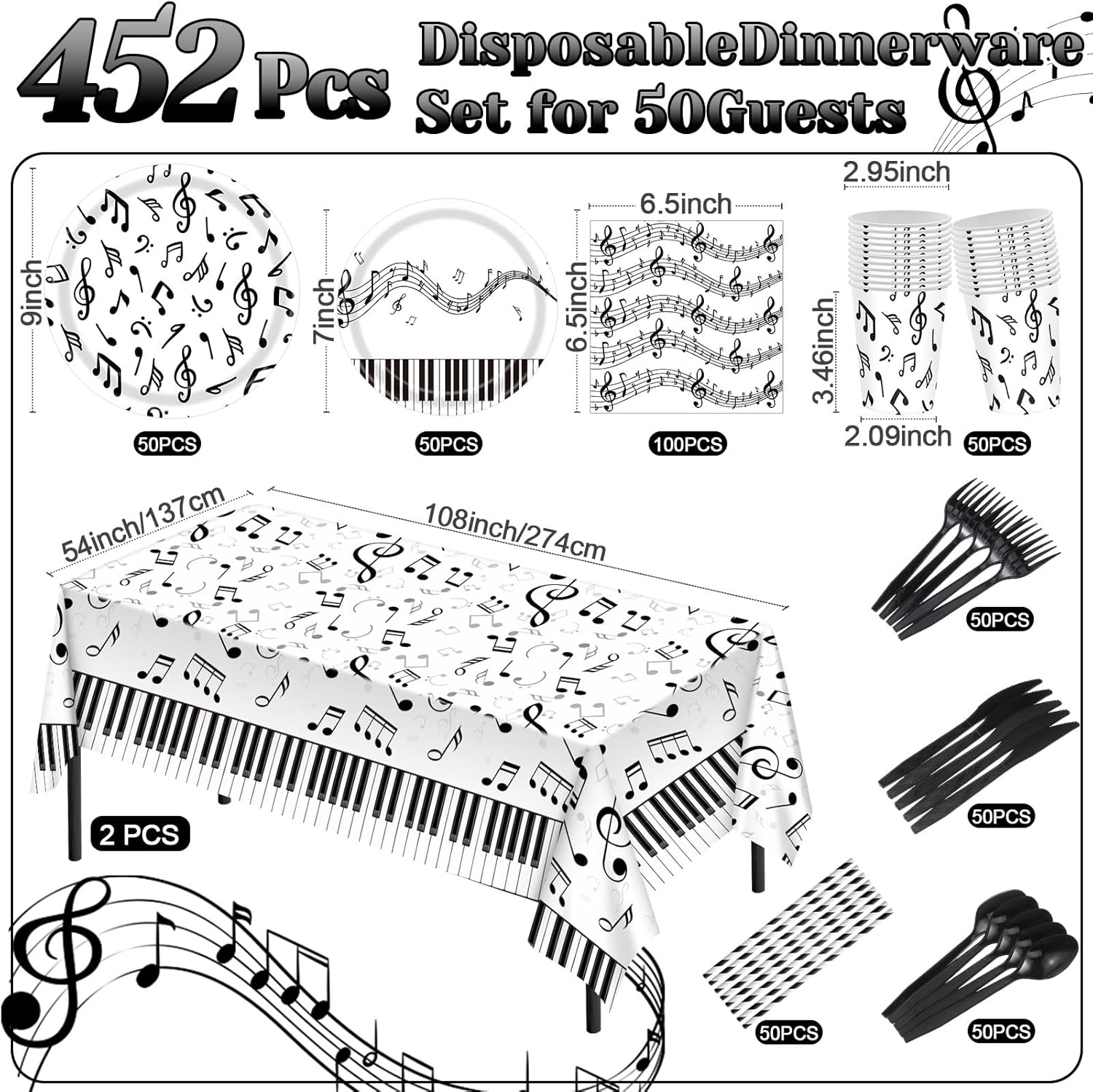 - Complete Set for 50 Guests: our music themed party decorations contain 100 each of paper plates (2 sizes) and napkins, 50 coffee cups, 50 sets of knives, forks, and spoons each, and 50 straws, it's a solution for daily dining table decoration needs, and we also include 2 large sized tablecloths