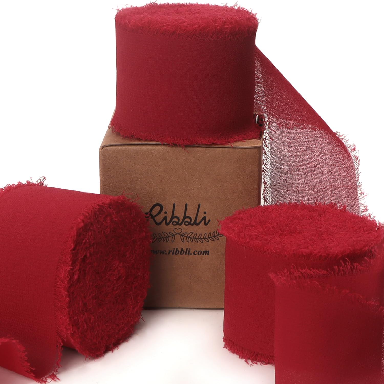 Ribbli Dark Red Ribbon 1.5 Inch x 3 Rolls Total 25 Yards Handmade Fringe Chiffon Silk Ribbon for Wrapping Wedding Invitations Bridal Bouquets DIY Crafts Home Decor