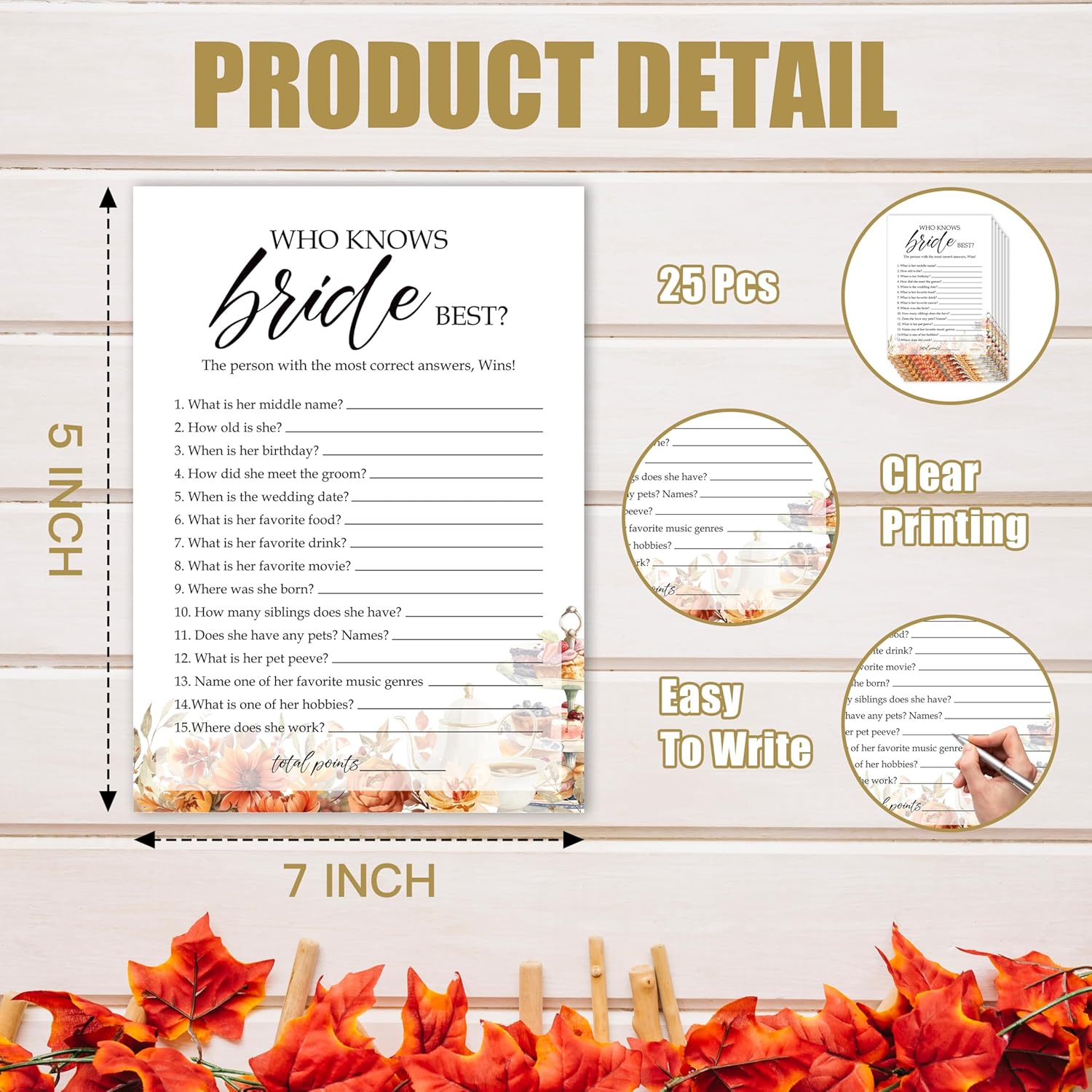 Fall Bridal Shower Games Cards, Who Knows Bride Best Wedding Bachelorette Party Games, Fall in Love Bridal Shower Decorations, 25 Cards, G07