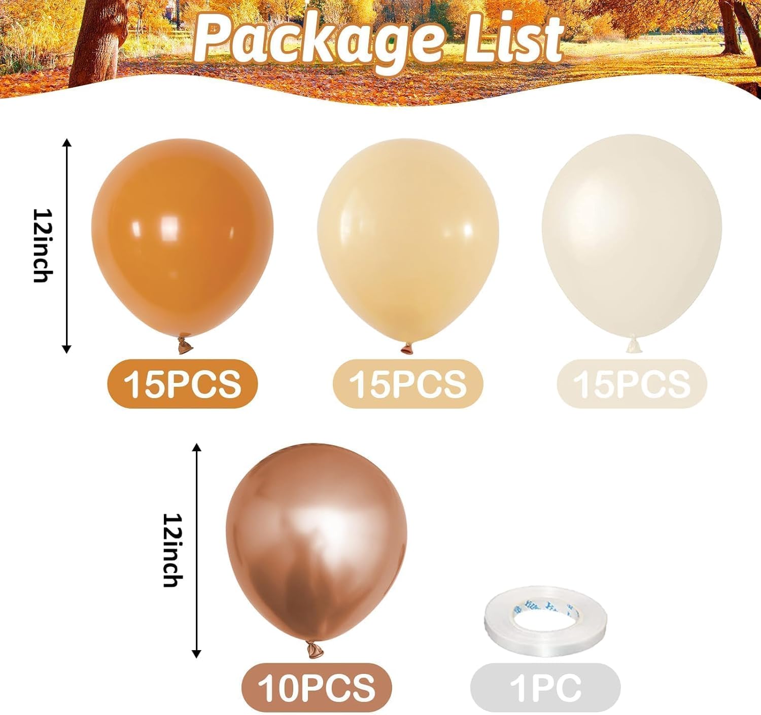 - Rich Autumn Color Set: This 12 inch fall balloons set includes 15pcs burnt orange balloons, 15pcs beige balloons, 15pcs white sand balloons and 10pcs metallic copper balloons plus 1 ribbon. Create memorable waiting to exhale party decorations and fall balloons arrangements with confidence and ease.