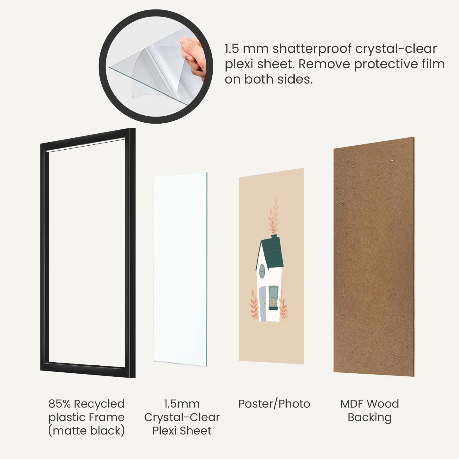 - ADVANCED SHIELDING - Cutting-edge Lightweight and Shatterproof Plexi Cover for poster frames. Crafted from 1.5 mm thick, transparent polystyrene, fortified with a dual-sided scratch-resistant film. Unveil pristine displays by peeling off the protective film before use (as illustrated).