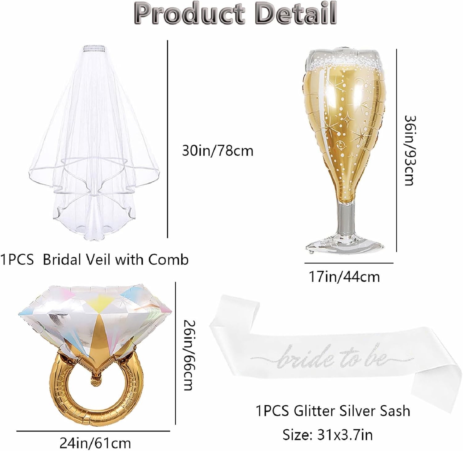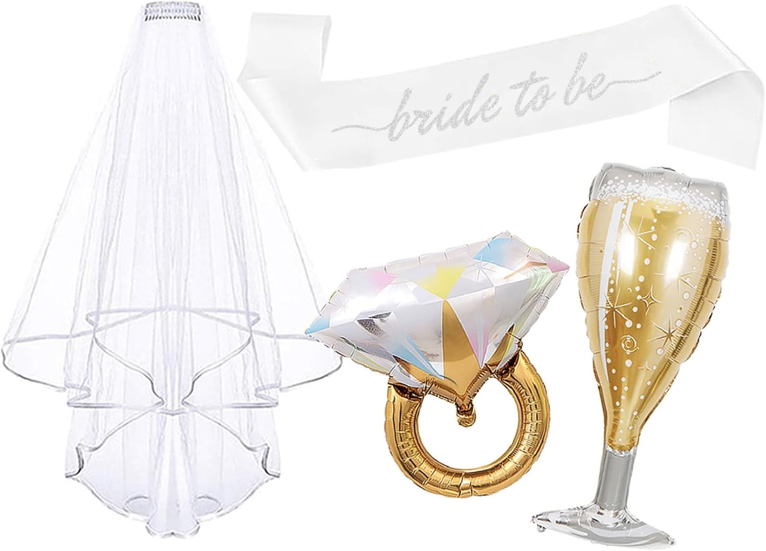 - 【Bridal Shower Set】You will receive: 1 x glitter silver bride to be sash(31.5in), 1x layer veil(30in), 1 x diamond ring foil balloons(26x24in), 1 x champagne glass foil balloons(36x17in). This bridal shower set will be the most beautiful accessory for bride to be and the most thoughtful gift for her