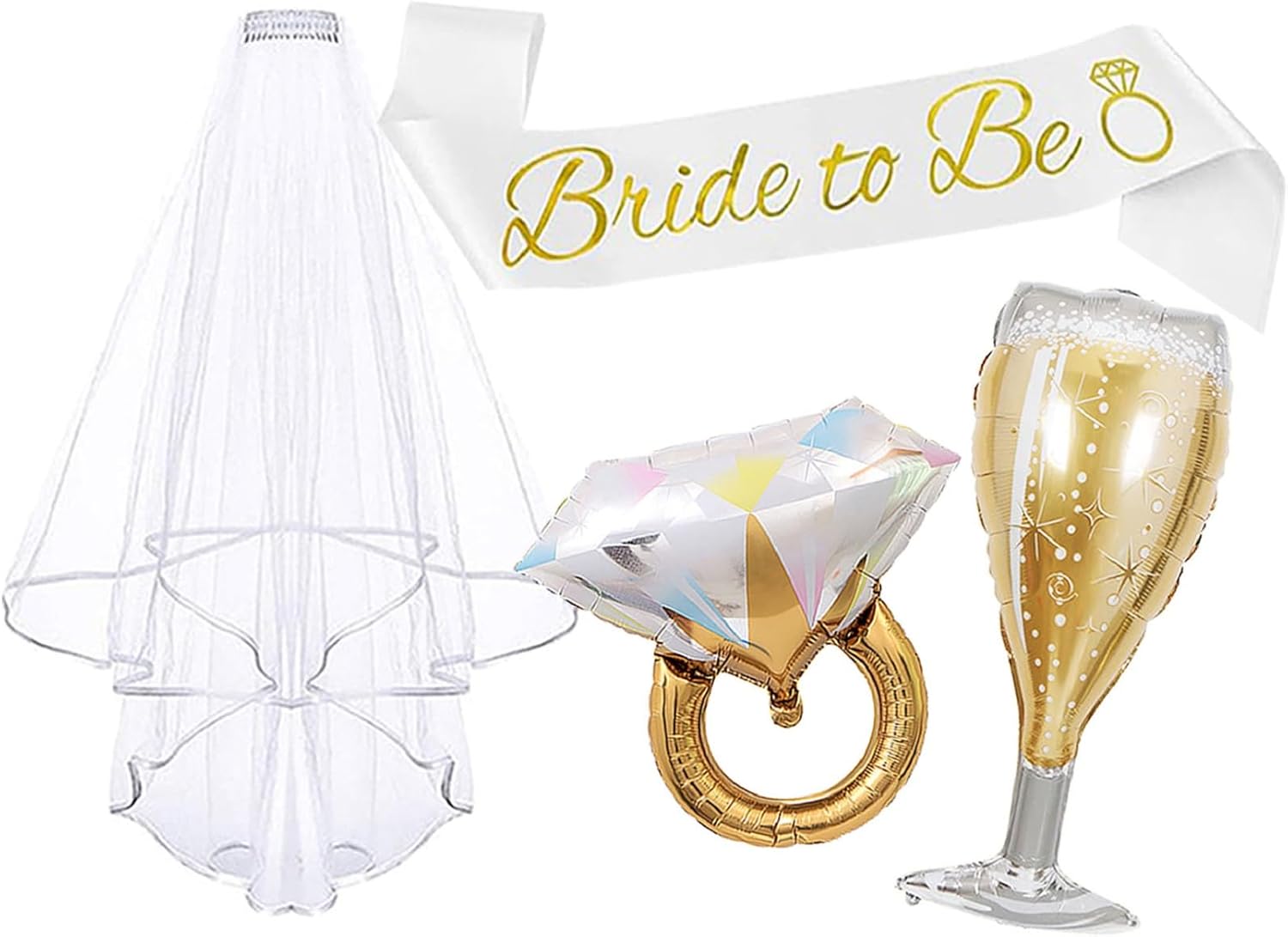 - 【Bridal Shower Set】You will receive: 1 x bride to be satin sash(31.5in), 1x layer veil(30in), 1 x diamond ring foil balloons(26x24in), 1 x champagne glass foil balloons(36x17in). This bridal shower set will be the most beautiful accessory for bride to be and the most thoughtful gift for her