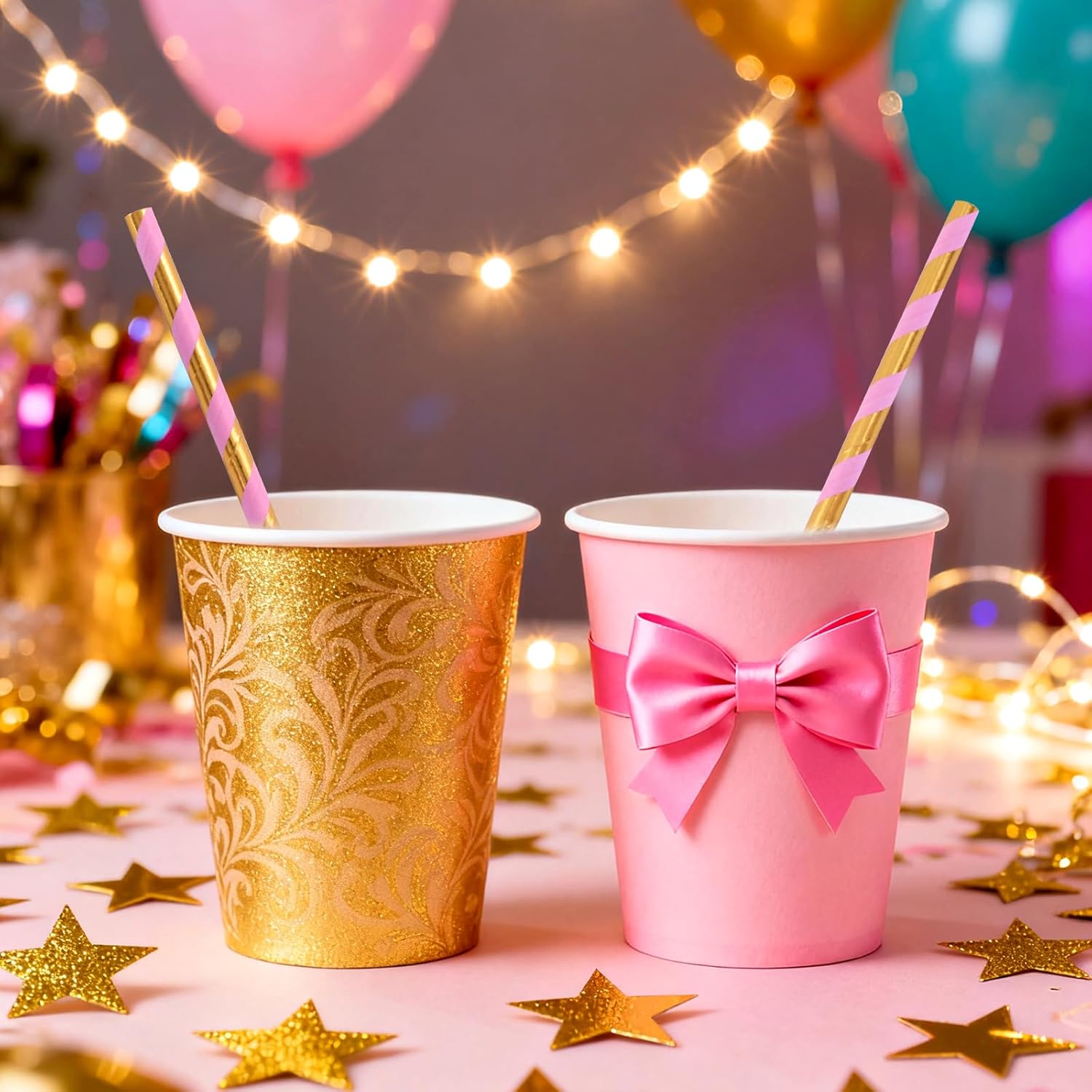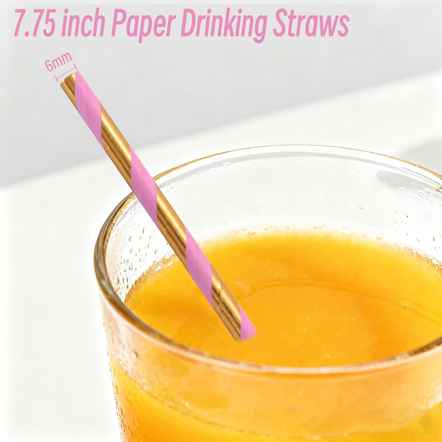 Paper Straws for drinking - Pink Gold Striped Biodegradable Disposable Paper Straws, 7.75 Inch, 100 Pieces