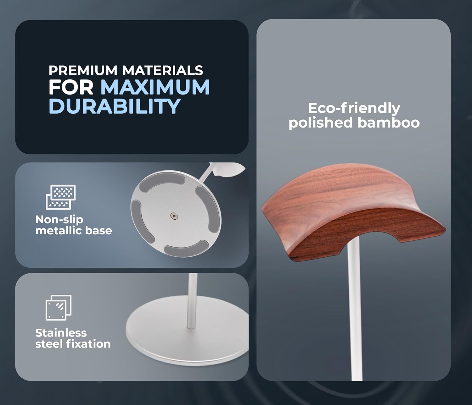 - Durable and Sustainable Materials: Crafted from eco-friendly bamboo and reinforced with metal, this headphones holder offers long-lasting support with a premium touch.