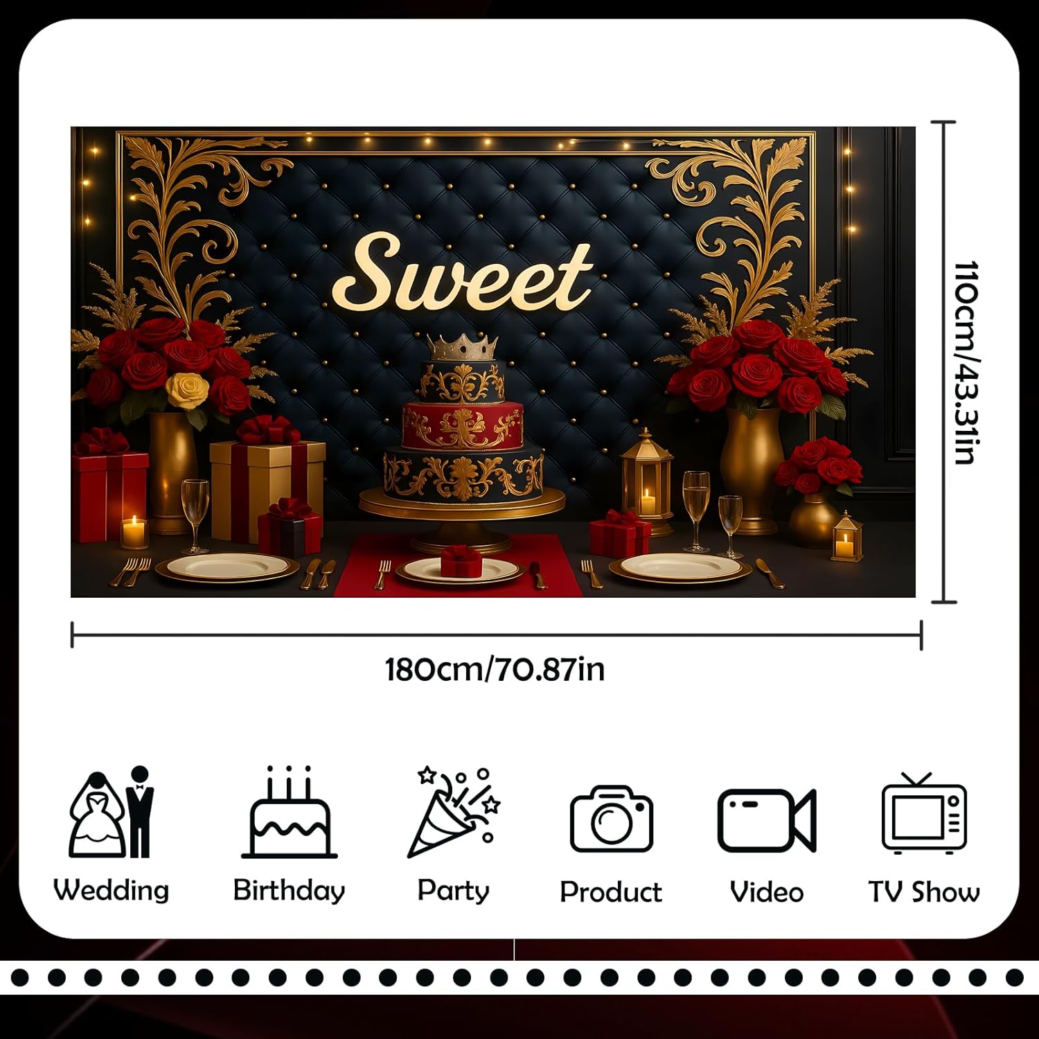 - Background: 1 Pcs 70 x 42 in , durable polyester fabric, easy to clean and store, lightweight and easy to carry; The professional production process makes this BlackGold theme banner reusable and colors vivid, not easy to fade Note: There may be slight creases during transportation. Before use, smooth the back by hanging or steam ironing.