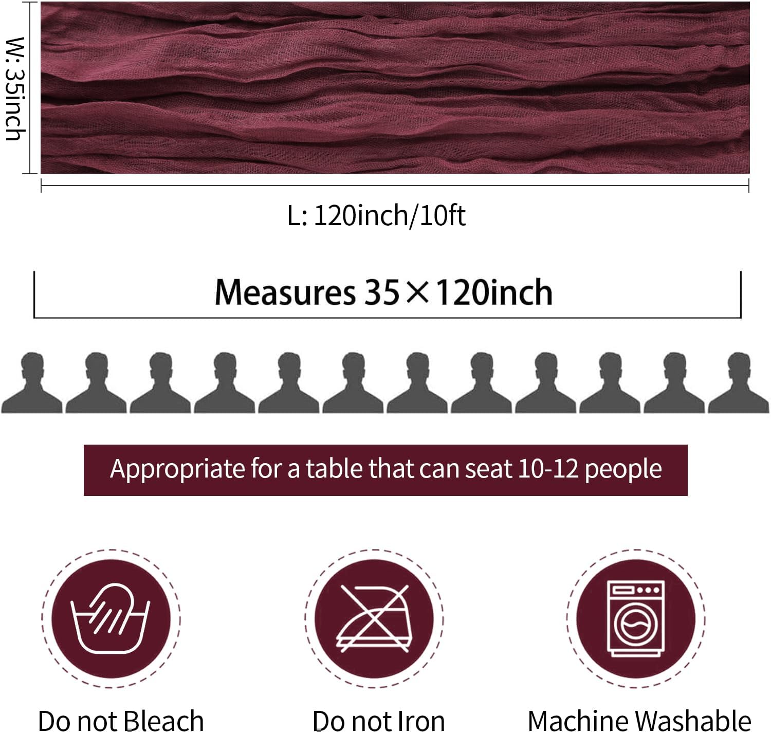 - đ·ăVintage Burgundy Table RunnersăYou will get 6 pieces 10ft length burgundy cheesecloth table runner, enough quantity is suitable for wedding banquets and various parties, the size of each red gauze table runner is approximately 35 x 120 inches / 90 x 300 cm, which is large enough to cover rectangle and round tables, can also be spliced together for long tables. Even can also cut it yourself for DIY chair cover sashes or decorative napkins, backdrop draping or even gift wrapping.