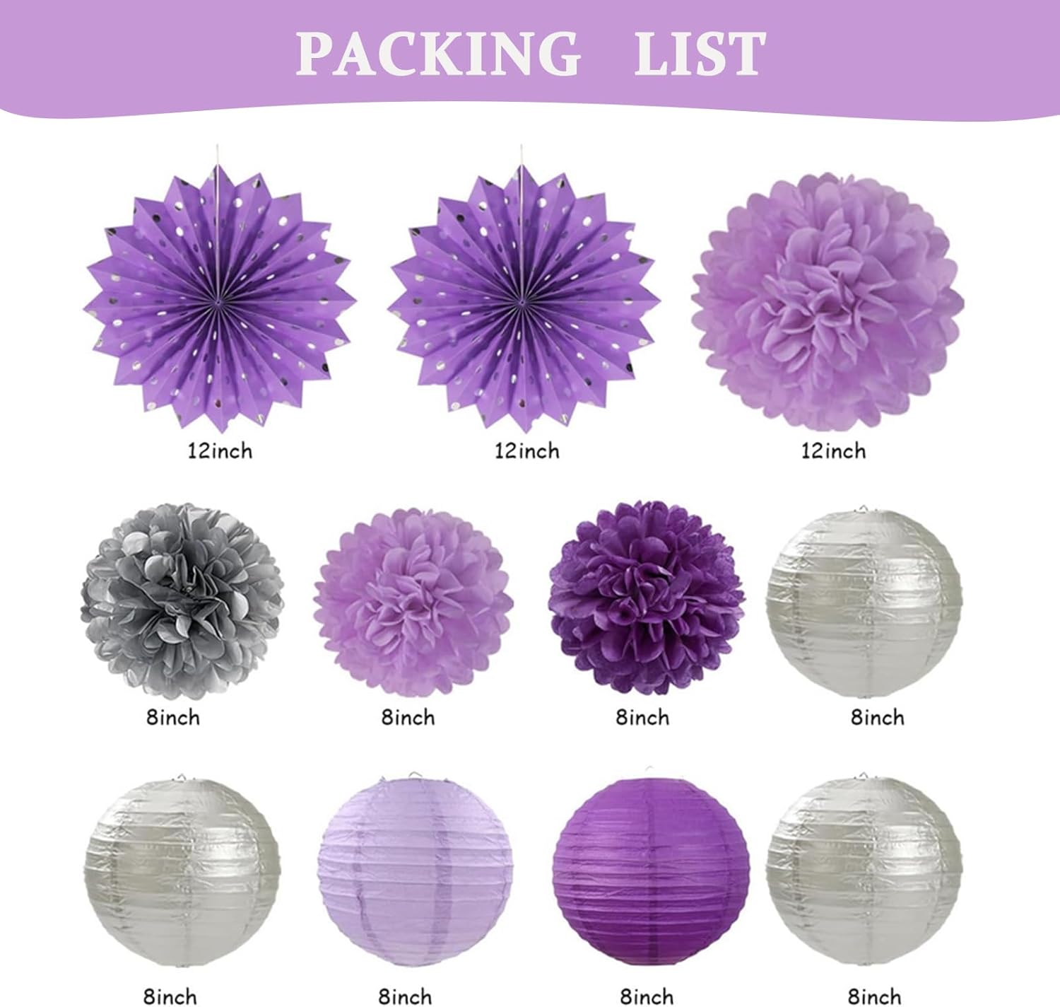 - 【Purple Party Decorations】This set includes: 1 purple birthday banner, 1 polka dot paper banner, 4 honeycomb paper balls (3 of 10" and 1 of 12"), 5 paper lanterns (8" each), 4 paper fan flowers (2 of 12" and 2 of 16"), and 6 paper swirl hanging streamers.