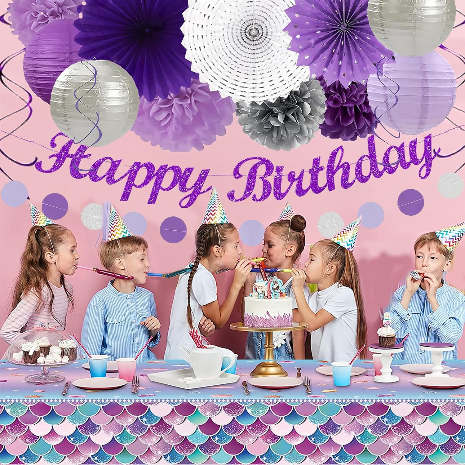 Purple and Silver Party Decorations-21PCS Happy Banner,Paper Lanterns Streamers,Tissue Pom Poms Honeycomb Flower Fan, Baby Bridal Shower Wedding Retirement Bachelorette Hanging Supplies Decor