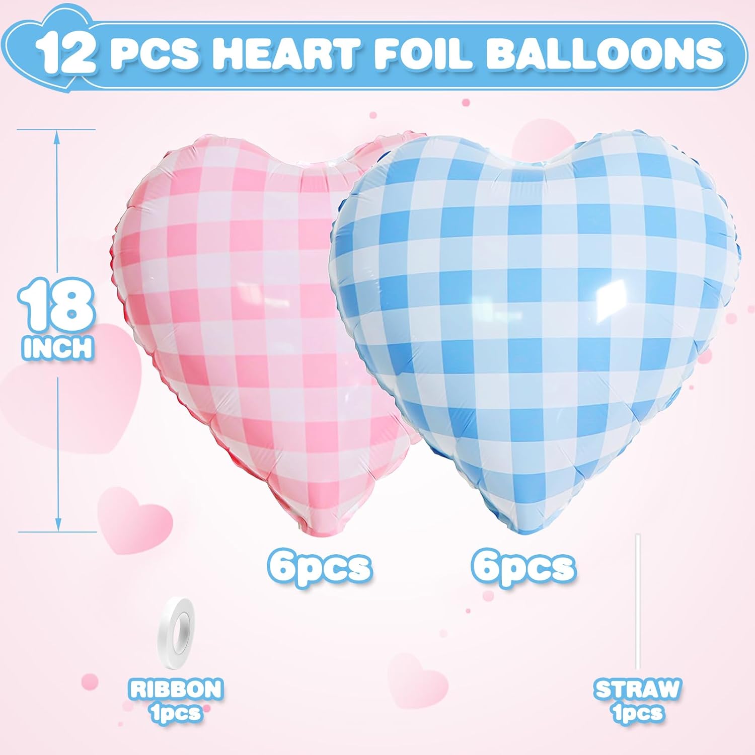 - 12PCS HEART BALLOONS:Package include 6pcs blue white checkered heart foil balloons,6pcs pink white checkered heart foil balloons,1pc straw.Large enough to help you better decorate your party.