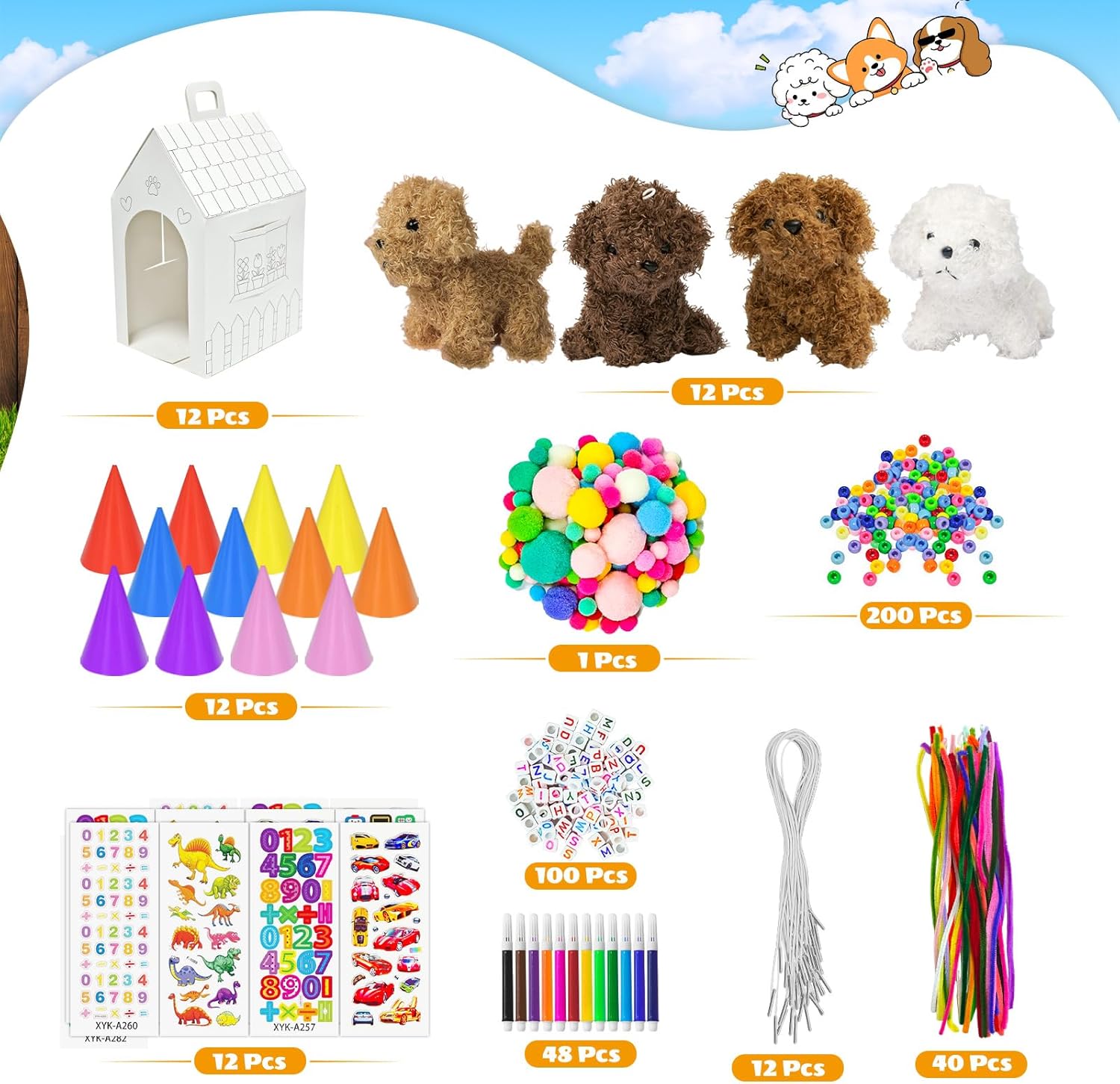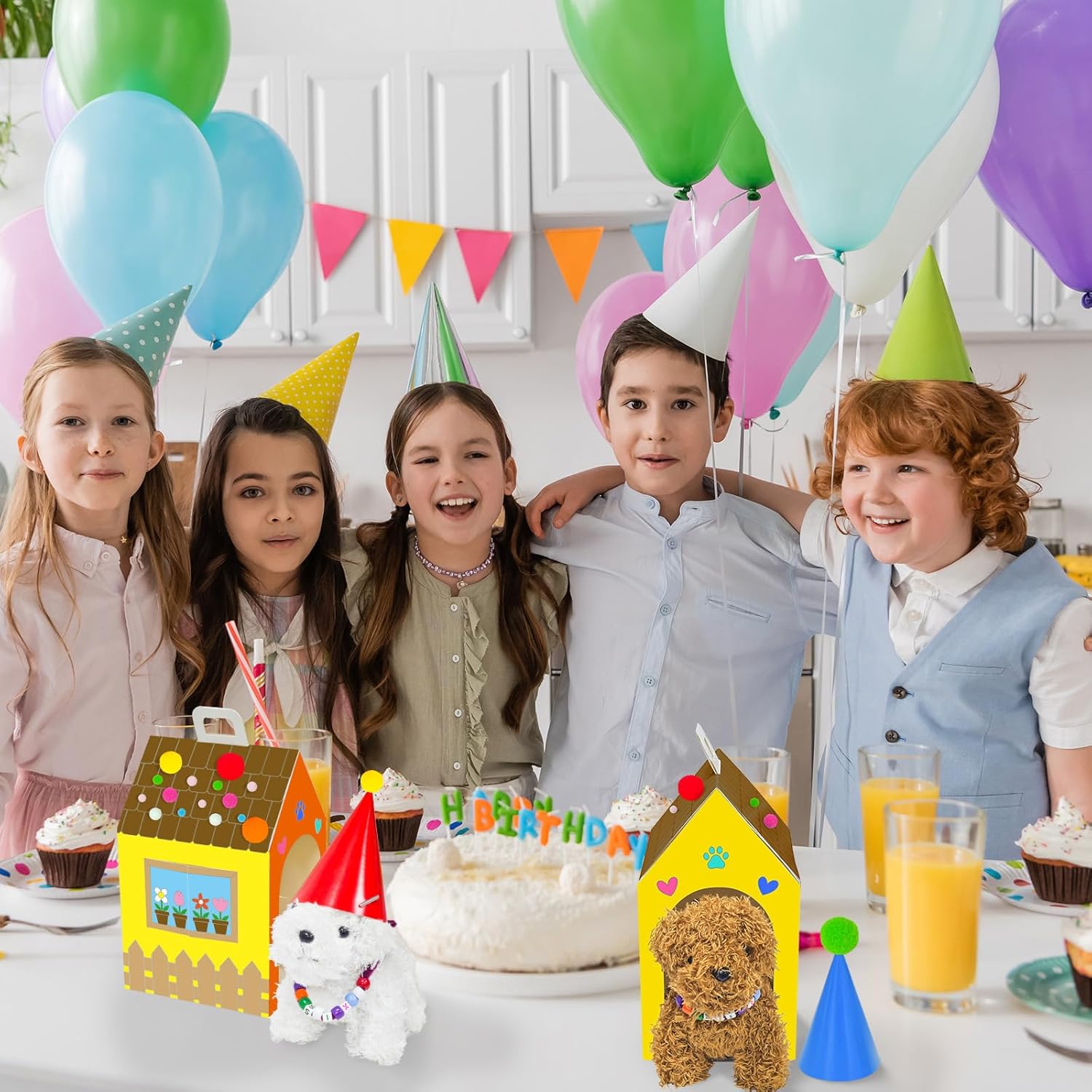 - Adopt a Puppy Party Set: This adoption-themed kit includes 12 DIY white doghouse gift boxes, 12 small decorative dogs (approx. 3.93 inches), 12 colorful hats, 12 elastic cords, 12 3D dog-themed stickers, 1 pack of mixed-size pompom balls, 24 color markers, 40 pipe cleaners, 100 colorful beads, and 100 letter beads—perfect for making personalized collars.