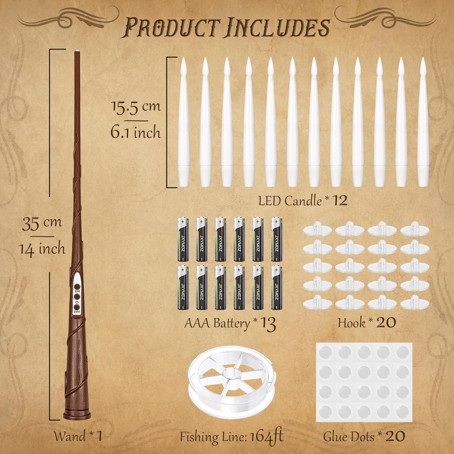 - Package List: 12* candles, 13* AAA lithium batteries, 12* fishing line, 12* glue dots, 1* magic wand, 1* user manual. We value each customer, and our after-sales team will provide each customer with satisfactory service and ensure you have the best experience possible. if you have any questions, please contact us, and we will answer you as soon as possible