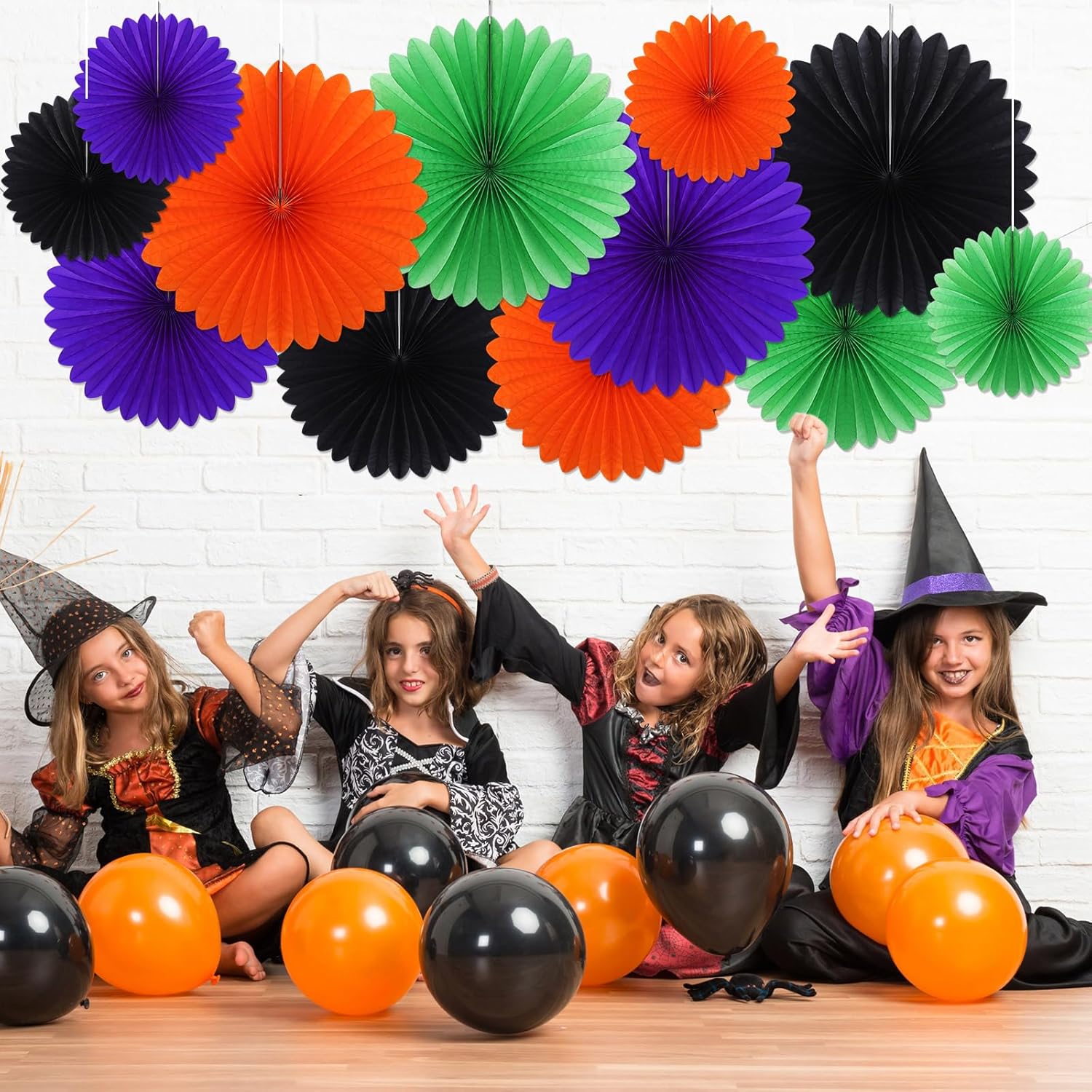 - Vibrant Halloween Party Decorations: will receive 24 paper fans in 4 colors, including 8 pcs 16 inches, 8 pcs 12 inches and 8 pcs 8 inches, each halloween ceiling decorations paper fan comes with a paper clip and hanging string; The paper fan flower set is not only eye catching but also adds elegance and natural beauty to your party decoration