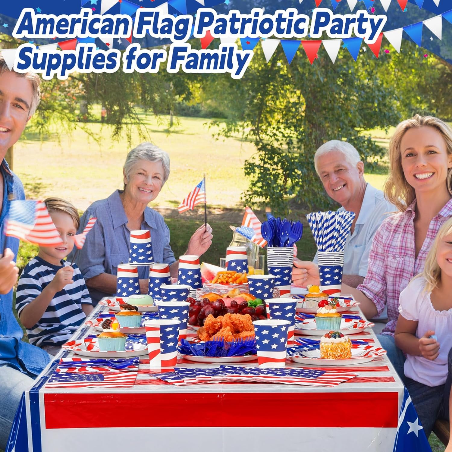 - Quality Material Adoption: crafted with durable materials, our patriotic party decorations boast durability and reliability, each plate, cup, napkin, and straw is made of sturdy paper, ready for both hot and cold beverages, and meals, the knives, forks, and spoons are constructed from robust plastic, providing a strong cutlery solution for your food servings, and this tablecloth is a PE plastic offering ideal coverage and protection of your surfaces