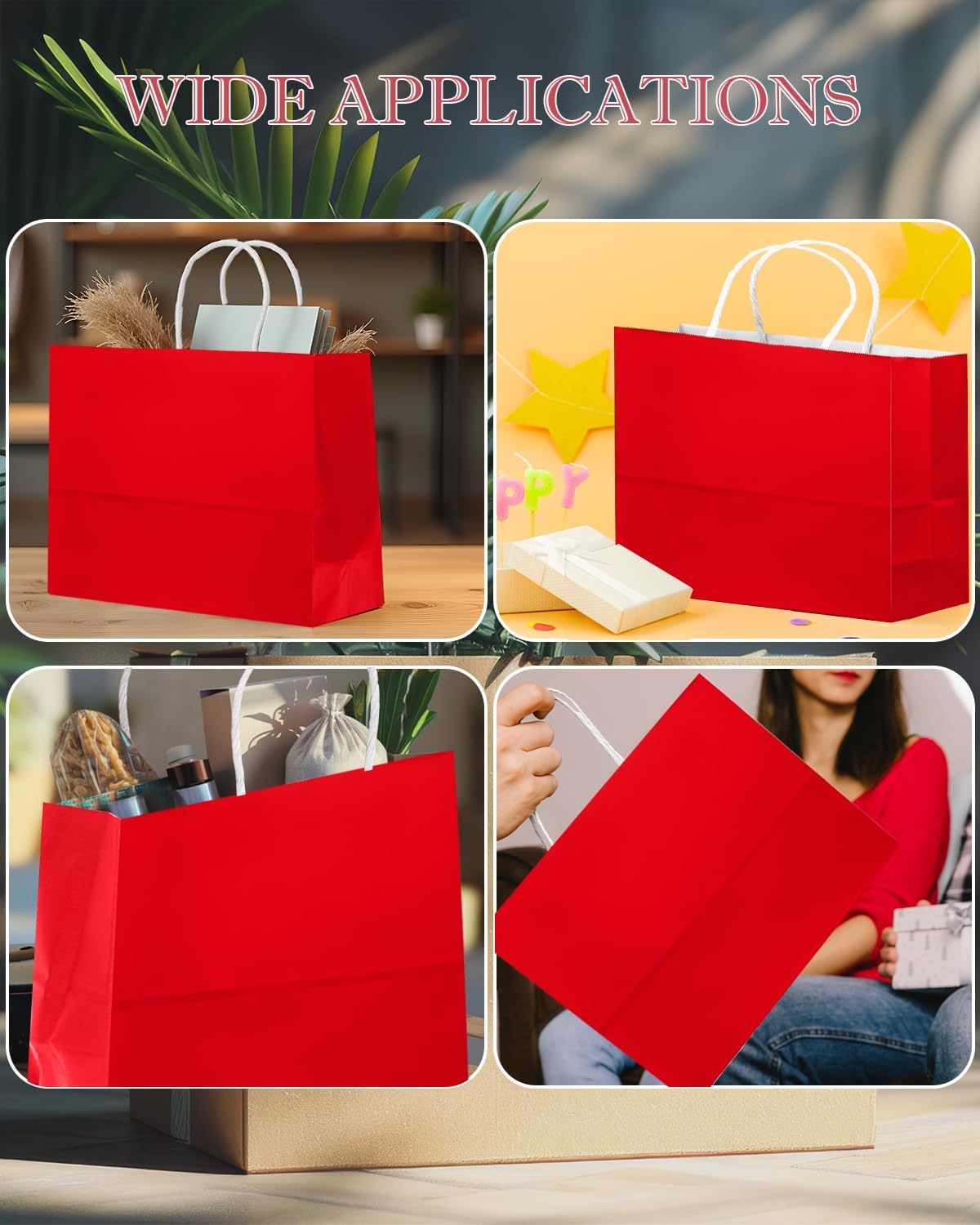 qiqee 50-Packs Red Paper Gift Bags with Handles Bulk 12.6"x4.3"x10" Wide Large Size Party Favor Bags Multiple Uses