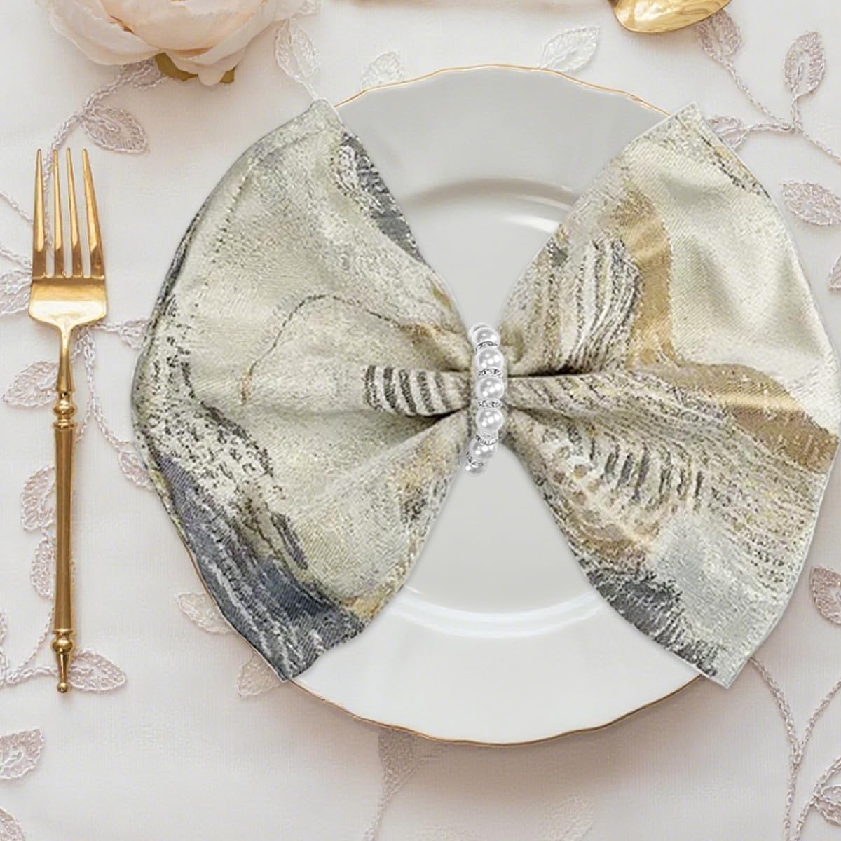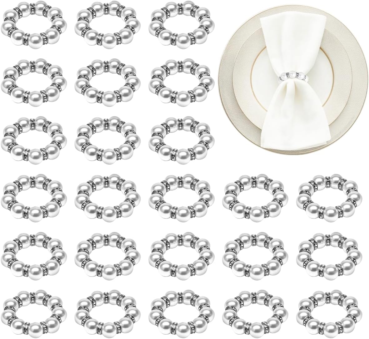 - 【Easy to Use】Pearl napkin ring set adopt a cross-spaced design with rhinestone, resulting in a glossy and smooth surface. They are finely polished and cut, strong and wear-resistant, maintain structural integrity through repeated use, resisting breakage and deformation. The napkin rings features an elastic stretch design for easy and quick operation. Handkerchief napkins can be quickly installed and removed by simply stretching them