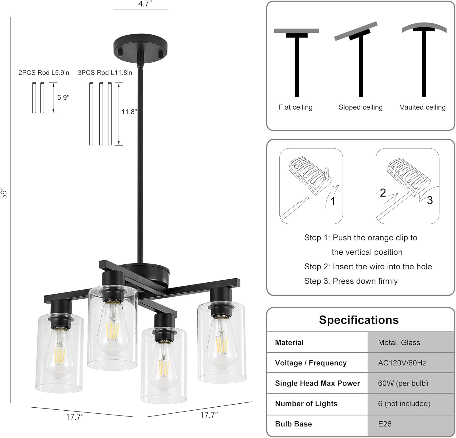 - 【Bulb Requirement】This black kitchen island chandelier is equipped with 4 E26 bulb bases, compatible with various bulb types such as incandescent, LED, CFL, and halogen bulbs (bulbs NOT included). The dining table chandelieralso works with dimmer switches (sold separately)—pair it with dimmable bulbs to create warm and relaxed atmospheres. The 4-light design provides ample brightness while diffusing soft, even light, avoiding harsh glare and adding a cozy ambiance to your home.