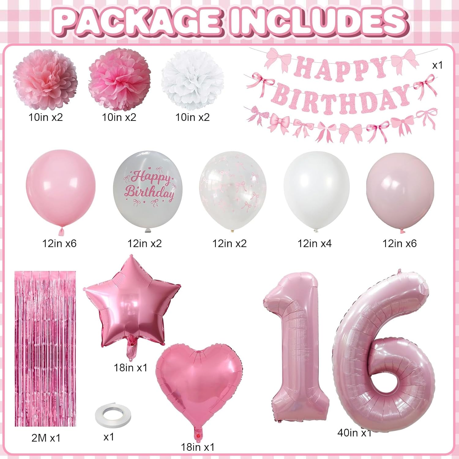 - PACKAGE INCLUDES: 1pc pearl pink number 16 balloon, 1pc bow happy birthday banner, 2pcs pink paper pom poms, 2pcs light pink paper pom poms, 2pcs white paper pom poms, 1pc pink curtain, 1pc light pink star foil balloons, 1pc light pink heart foil balloons,6pcs light pink balloons, 6pcs pastel pink balloons, 4pcs white balloons, 2pcs birthday printed balloons, 2pcs bow clear balloons, 1pc ribbon