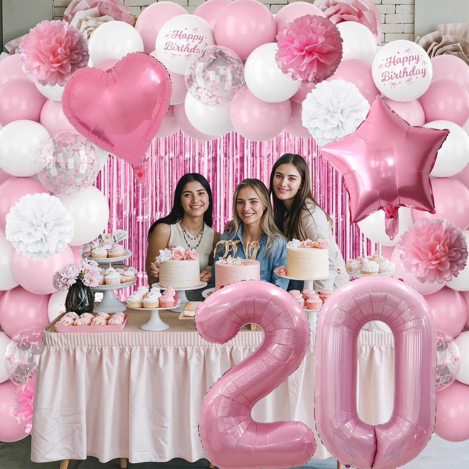 - ALL-IN-ONE DECORATION: Includes pearl pink number 20 balloon, bow “Happy Birthday” banner, pom poms, fringe curtain, foil balloons, latex balloons, special printed balloons, and ribbon – a complete set to decorate your party easily; designed especially for girls turning twenty, this decoration set is ideal for birthday parties, home celebrations, and photography scenes, making the day extra memorable